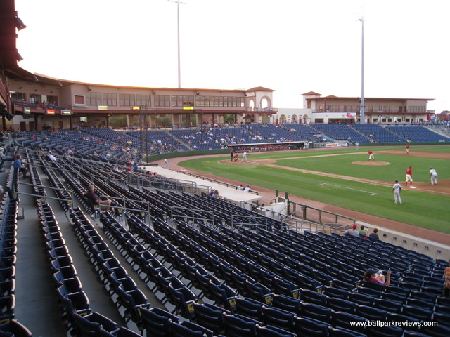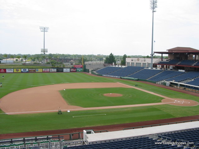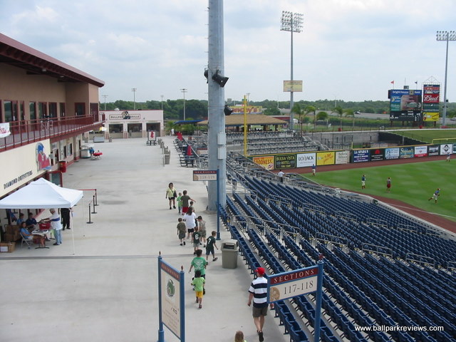 | As with most of the facilities in the Florida State League, Spectrum Field (now known as BayCare Ballpark) was built for spring training, so seems like overkill when the minor league season starts. Having only seen FSL games here, I can only assume that watching a Phillies spring training game is much more enjoyable. The ballpark is located right along busy Route 19, so you can hear the traffic rumbling by throughout the game. This is some difference from Jack Russell Stadium which was tucked away in a quiet residential area. The exterior of the new ballpark is nicely landscaped with a stucco finish and a large wishing well located at the main entrance. The interior is very expansive, which is probably needed with the big crowds in spring training. The design is very similar to what is found at other new minor league parks. There is a full wraparound concourse where the field can be seen from any location on it. All seating is of the green fold down chair variety. With the large capacity, some of the seats are a bit far from the field, but this is only a concern during spring training. There is also a small club level section of seating on the first base side. Grass berms are located behind the left and right field fences, allowing fans to spread out with their blankets. The most unique aspect of Spectrum Field is the tiki bar in the left field corner. I'm sure this must be the most popular spot in the ballpark on most nights. A large gift shop is located off the concourse on the third base side. Concessions, even for FSL games, are well varied and reasonably priced. Chicken sandwiches, burgers, and Philly cheese steaks (of course) are some of the selections on the menu. The atmosphere was a bit different from other parks as there was no on field games, but there was lots of music played and several dances (Macarena, YMCA, etc) were done between innings. I attended on a camp day, so there was tons of screaming kids, but I assume the atmosphere on a regular night is a bit more relaxed. Many have called Bright House Field the best spring training venue in Florida. In terms of its structure and amenities, it certainly ranks high, but the location along a busy road detracts from the overall experience for me. I prefer the parks that are located in more quiet areas. Still, there is little doubting that this ballpark is an improvement over the outdated Jack Russell Stadium where the Phillies trained prior.