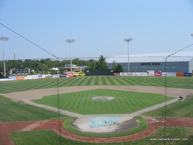 | Taylor Stadium is located on the campus of the University of Missouri. The park was originally built for the Missouri baseball team, which explains all the Tiger logos displayed throughout the park. And the ballpark really feels more like a college park than a minor league park. The seating is steep and set high above the field. The concourse area runs behind the grandstand and is out of view from the field. The Mid-Mo Mavericks played here for three seasons, but did not draw well so decided to sit out the '06 season while trying to get a new ballpark built in Columbia. So it's unlikely that Taylor Stadium will ever see pro baseball again.