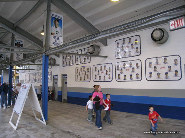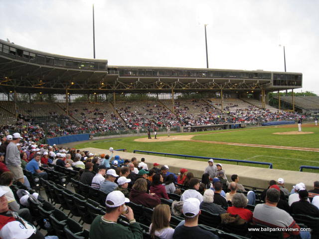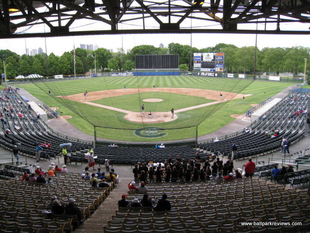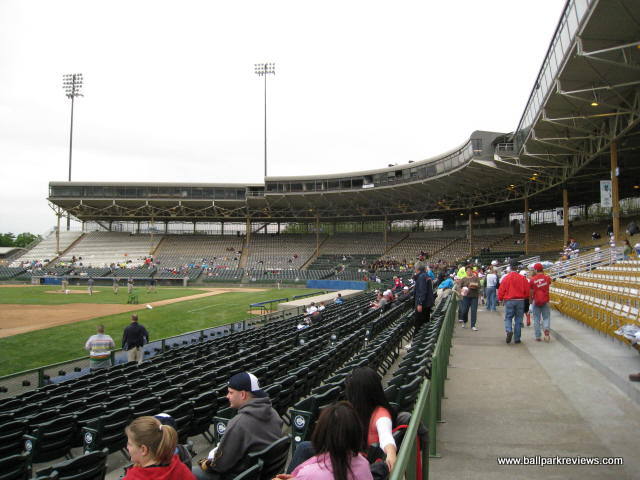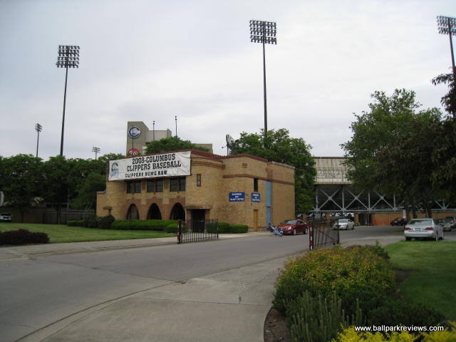 | Cooper Stadium hosted its final year of professional baseball in 2008 as a new downtown ballpark is on track to open in Columbus for the '09 season. Though completely renovated and modernized in 1977 (it was among the first ballparks to have luxury suites), Cooper Stadium still feels more like a 1930's era park, which is when it was originally constructed. It features a massive covered grandstand that runs from first base to third base as well as a large bleacher section down the left field line (that is closed unless large crowds are expected). The concourse runs underneath the grandstand and is perhaps the best feature of this old ballpark. Murals of all the Clippers teams since 1977 line the concourse walls. In addition, banners of famous Clippers alumni are hung from the rafters. They have really done a great job of honoring their history here - hopefully that is something that will continue at the new ballpark. There are plenty of concession stands located along the concourse, meaning lines are never long. The food selections are not that well varied, but the prices are cheap and quality is pretty good. The night I visited is 2008 they had $1 bratwursts - you can't beat that ! As can be expected at an older park, the seating is a bit cramped, but sightlines are pretty good as long as you don't get stuck behind a pole (which should not happen since crowds are never that large). One of the cool features of the grandstand are the ramps that are located at the back of it which lead directly to the concourse. This means fans sitting towards the top need not traverse down the stairs in order to get to the concourse. Cooper Stadium also features a "monument park" behind the right field fence which honors some of the past Clipper players. Unfortunately, it is closed before and during games. The atmosphere, as is the case at most AAA parks, is pretty laid back with only a few of the between inning games you'd see at most minor league parks. I visited here first in 1996 when they still had artificial turf, but fortunately real grass was installed in 2000. In addition, other renovations (a new picnic area and souvenir store) were completed since my first visit. Despite being in its last year, Cooper Stadium did not feel at all run down or neglected during my '08 visit. Certainly I would have preferred to have seen a Pawtucket-like renovation done here in order to keep the old ballpark in use, but the team and city obviously had other ideas. After sitting empty for a few years, all but the third base grandstand was torn down in 2014. There are plans to turn the site into a racetrack.