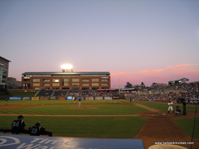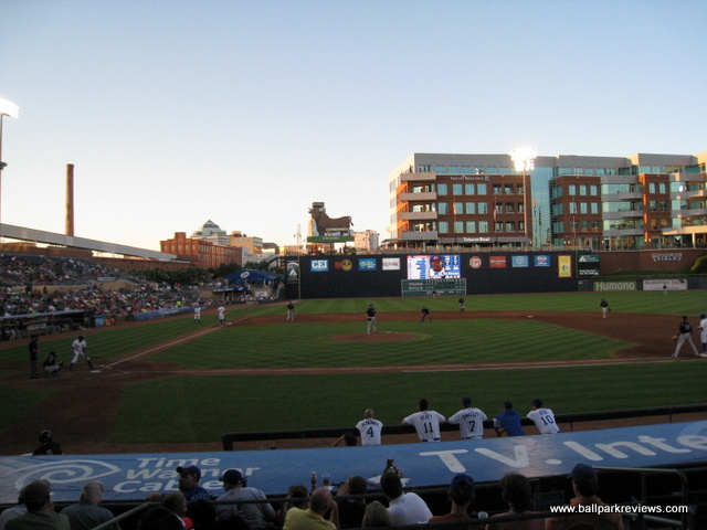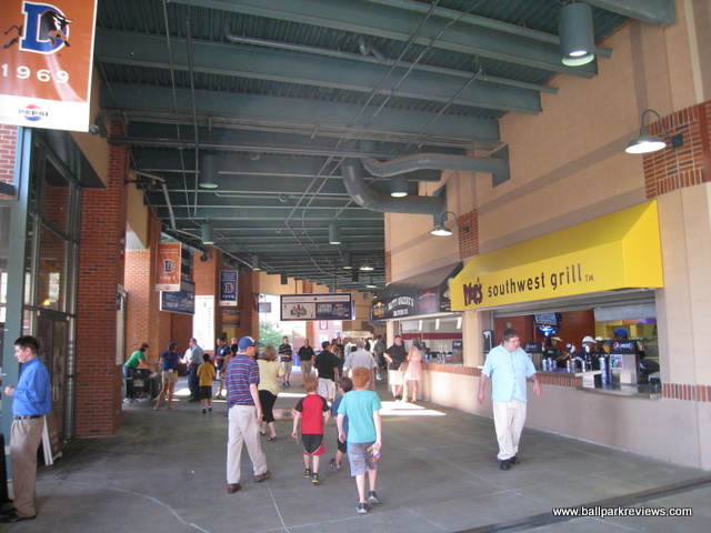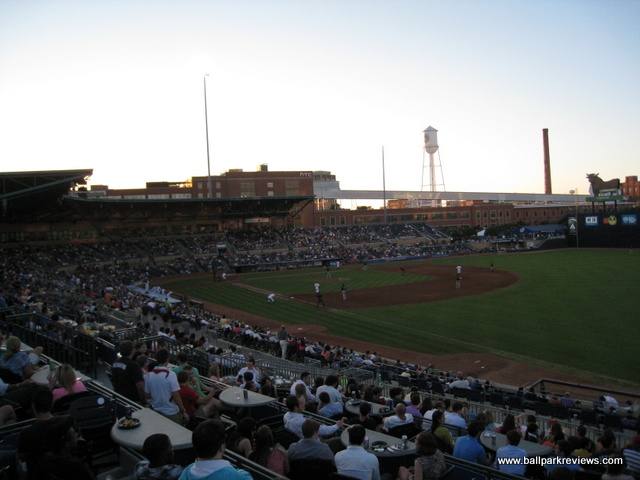 | Durham Bulls Athletic Park (DBAP) is certainly one of the finest (if not best) AAA parks in the country. From its brick exterior which fits in perfectly with the old tobacco warehouses, to the immaculate interior featuring a cantilevered room (with large fans to keep the crowd cool on hot days), DBAP is simply a great place to see a game. The seats are comfortable, have wide aisles, and are all quite close to the action. Among AAA parks, it is certainly one the most intimate. Left Field features a mini-"Green Monster" that is about 25 feet high and contains a hand operated scoreboard as well as a large video board. The animated bull, made famous in the Bull Durham movie, has been moved from the old park, and now sits upon the left field wall. The seating bowl is split by a spacious middle concourse, something which I don't usually like, but is necessary here since the main concourse is located out of view from the field. A large gift shop is the first thing that greets you as you walk into the park. After walking up a flight of stairs, you arrive in the concourse area which is loaded with a great variety of concession stands as well as plenty of reminders of the history of baseball in Durham. Included among concessions is a Mexican stand (Moe's), burgers, and Chick-Fil-A. Oddly, there is no BBQ to be found, which is quite rare for a park in the south. Apparently Dilliard's BBQ used to be here, but since the restaurant went our of business, the Bulls have not replaced them. Prices are quite reasonable and the food tasty. I first visited DBAP in 1997 and then not again until 2012. What a difference 15 years makes ! Office buildings now surround the park in the outfield, new seats have been installed in right field, and new picnic areas have been created. I have just a couple small complaints about DPAP. First, there is not enough entranceways to the seating area - just two narrow ones down each line. Secondly, it would be great if fans could completely circle the park. I have seen some reviews that say you can, but I was unable to during my visit in 2012. As for the atmosphere, it is also one of the best you'll find in the minors. Most fans seem into the game and there are very few distractions (for either kids or adults). There really is very little not to like at DPAP - the downtown setting, excellent concessions, and fine baseball atmosphere all combine to make this a great minor league ballpark.