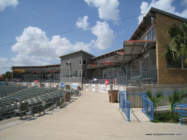 | Among the ballparks in the United League that I have seen, Edinburg Stadium is probably the nicest. I have yet to see a game here, but from my brief stop to snap some photos, this looks like an excellent place to see a game. From a structure standpoint, the ballpark doesn't break any new ground, but it does have a few unique touches. Most notable are the wavy awnings that cover the luxury boxes and picnic areas. Also, instead of building the luxury boxes up, they are on the concourse level and much closer to the action. This means that concession stands are not in view of the field, but that matters little to me. Hopefully I will get back here for a game sometime in the future. Unfortunately, the future of pro baseball in Edinburg looks bleak as no team has played here since 2011. In 2016, the ballpark was turned over to the University of Texas - Rio Grande Valley and renamed UTRGV Baseball Stadium.