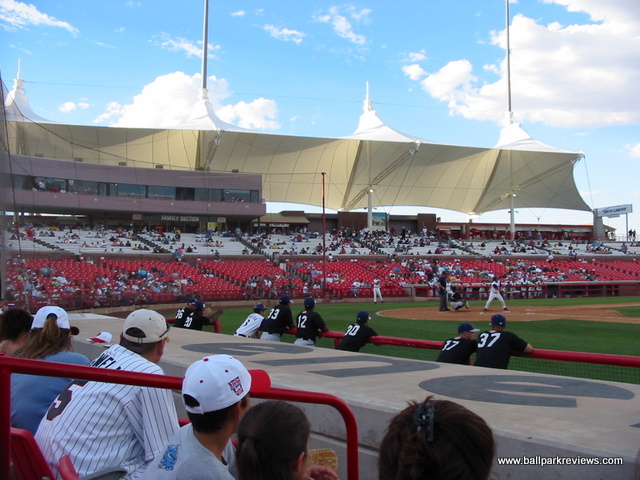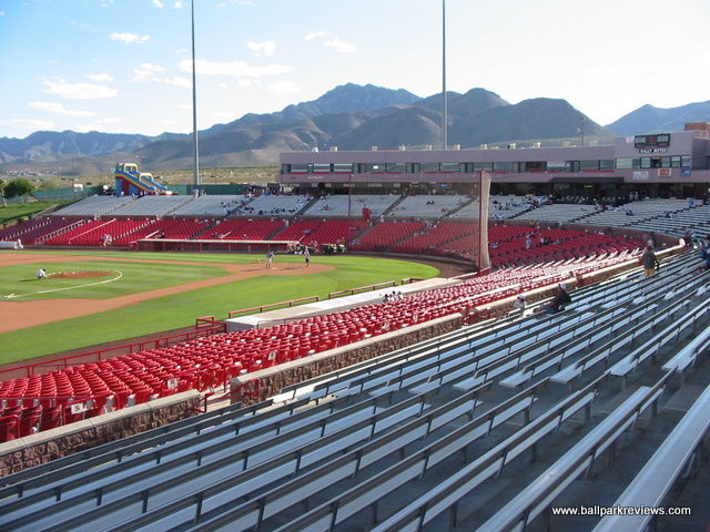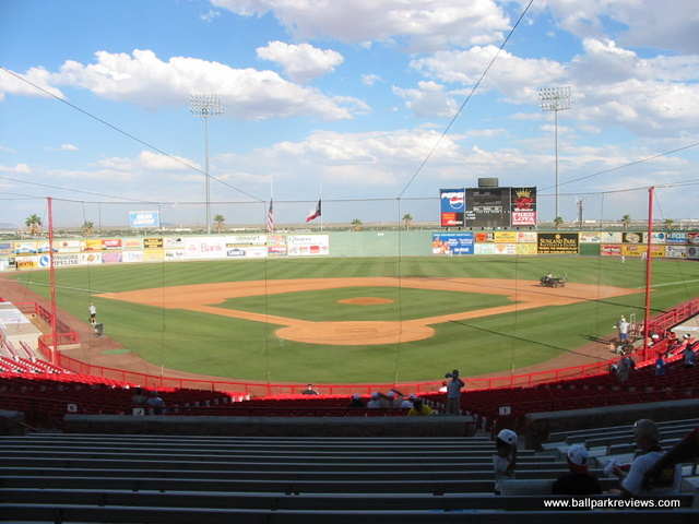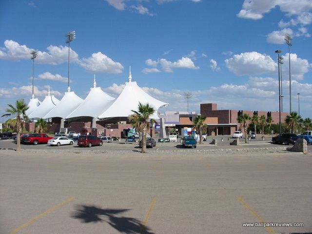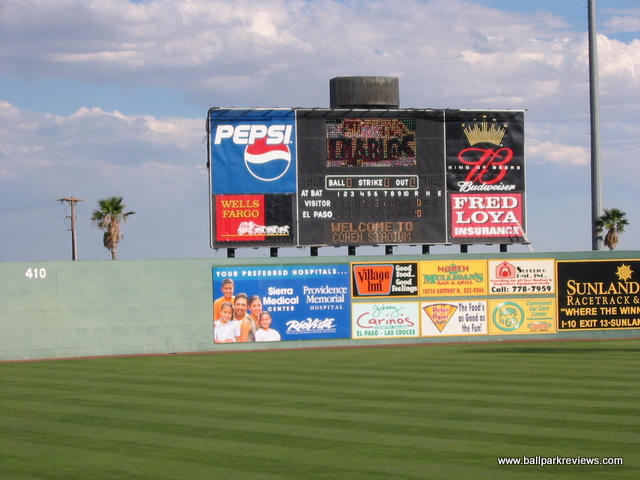 | On a visit to Cohen Stadium, be prepared to be bombarded with sound effects, an annoying PA announcer, and an atmosphere that is more conducive to a circus rather than a baseball game. The ballpark itself is fine, but the whole experience needs to be toned down a bit. It is no wonder they don't draw better - the team certainly has no interest in trying to bring baseball fans to the park. Cohen Stadium is an early version of the now common ballpark template. Fans enter on a wide concourse which overlooks the seating bowl and field. A canopy was added above the third base concourse several years ago as this are was previously uncovered. This is certainly a welcome addition as it can be quite warm in El Paso during the summer months. The seating bowl is very reminiscent of Prince Georges Stadium (Bowie, MD) as it features half fold down chairs and half metal benches. The grandstand is is rather high so some of the seats are a bit far from the field. A picnic area is located in left field and a grassy berm in right field. Cohen Stadium is located north of the city in what should have been a very scenic location. Unfortunately, the park does not face the surrounding mountains. Concessions here are average at best. The usual ballpark fare (burgers, hot dogs, brats, pizza) is offered, but strangely there are no Mexican options. A small team store is located off the concourse behind home plate. Certainly the most memorable part of my visit to Cohen Stadium is the atmosphere. While I thought this experience only existed in the Northeast, unfortunately I was wrong. It all starts with the "cool" PA announcer who was constantly urging the crowds to cheer and make strange noises. For a whole inning he requested that fans howl at the full moon. And if that wasn't enough, there are tons of sounds effects and music played between pitches and at-bats. And of course between innings there was the usual on-field games. All these gimmicks combined with tons of bratty kids running around made for a rather unpleasant night at the park. I prefer to relax when I go to a ballgame, but that is almost impossible to do here. Certainly the El Paso area is big enough to support baseball, but I just wonder if the over-the-top experience at Cohen Stadium has turned some people off. Apparently it did as attendance dwindled to a point where the Diablos were sold and moved to Springfield (MO) after the 2004 season. Fortunately, the Central League quickly moved in and put a franchise here. The bottom line is that if you are a fan of baseball, Cohen Stadium is probably not the ideal place to see a game. With the arrival of the AAA Chihuahuas in 2014 and a new downtown ballpark, the Diablos are no longer. It is unclear what the future holds for Cohen Stadium, but pro baseball is very unlikely.