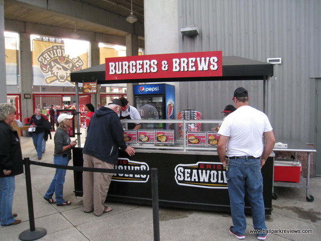 - A burger stand behind home plate serves up several unique burgers including mushroom and swiss, beer and bacon, and fiesta. A regular cheeseburger goes for $6 while the specialty ones go for $8. I tried the regular cheeseburger and was quite impressed with the quality.
