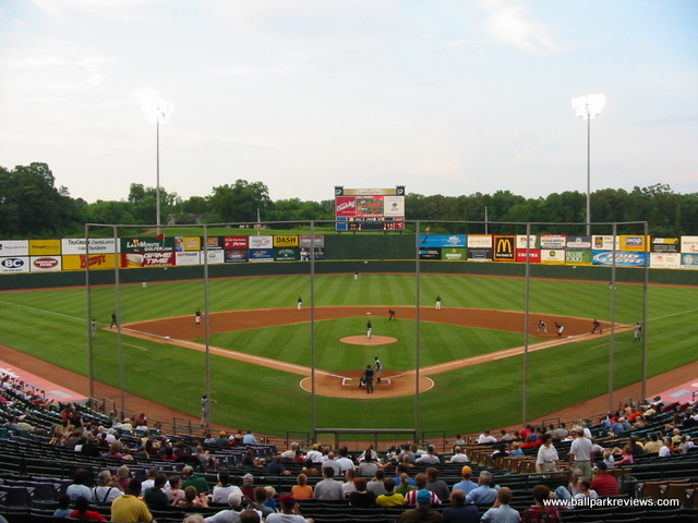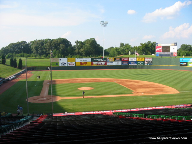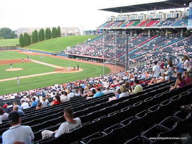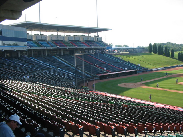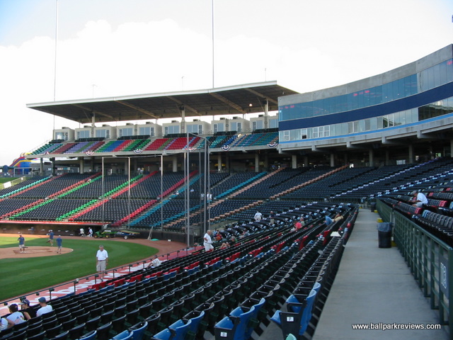(NC) Knights. Though it is a relatively new ballpark, the team has been trying to get Charlotte to build them a new downtown ballpark. It was simply built at the wrong time - just before the "retro" trend came along that dictated ballparks be built downtown and be more intimate. Knight's Castle is anything but intimate. While it does have a concourse that overlooks the field (apparently something that architects think fans are demanding these days), the seating bowl is just too high. It is also split by a center concourse (which is actually needed here due to how high the grandstand is) that pushes some seats back even further. While sightlines are fine, there are just too many seats that are not close to the field. There is also a upper deck which strangely features general admission seating - most teams would call this "Club" seating and charge twice as much for it. Grassy berms are located down each line for additional seating, but apparently they are only opened on nights when there are large crowds. The only unique aspect there is about the park are the rows of different colored seats. Though they are apparently the work of a fashion designer, they seemed ugly and pointless to me. I suppose that's why you don't normally consult fashion designers when building a ballpark. Concessions at Knights Castle are average at best. There is not much variety (Italian sausages, burgers, Subway, BBQ) and the quality is lacking. The atmosphere is very typical of the AAA experience : only a couple between inning games (race the mascot, dizzy) and not many sound effects. Homer the Dragon is the team mascot and is pretty active with the fans. The bottom line on Knight's Castle is "so what ?" There is nothing unique or interesting about this park and there was very little care put into the design of it. Which is why after the 2013 season, the Knights moved back to downtown Charlotte. Knight's Castle was demolished in early 2015 to make room for a distribution center that will be built on the site.