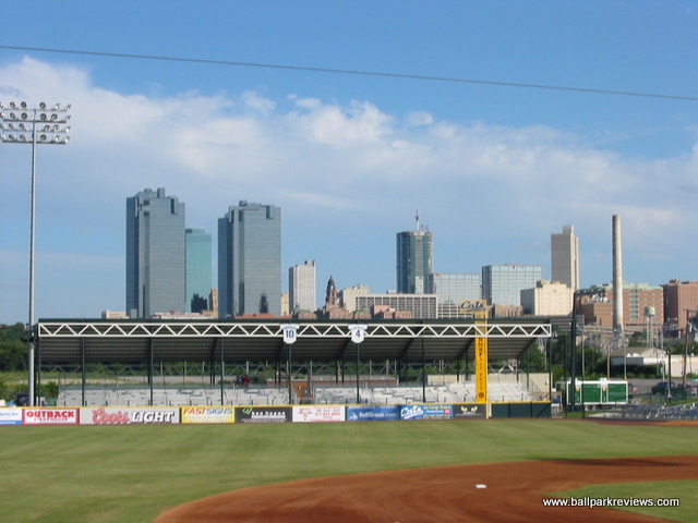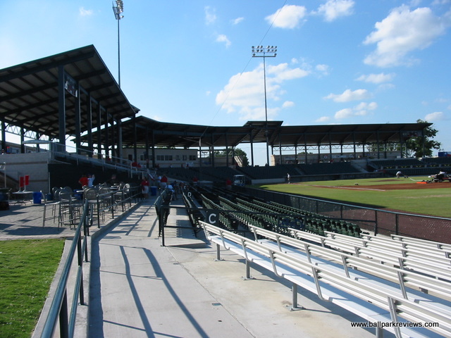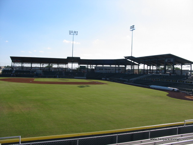 | This LaGrave Field is the second version of a ballpark on the same location. The previous ballpark was used from the 1940's to the 1960's to also host a minor league team named the Cats. After being torn down, this spot of land remained unused for many years until the new Cats came along in 2002. Certainly the team could not have found a better location to build the new ballpark. With the history of baseball on this site and the view of the Fort Worth skyline, it is just about perfect. LaGrave Field is a rather funky ballpark that really does not feel like any other. It has some elements of the standard new ballpark template, but also has some elements that make it unique. Overall, the park feels a bit chopped up due to the different seating sections. The reserved box seats offer the best sightlines in the park. The field box seats, located down the right field line, are close to the field, but are not sloped enough. Bleachers in left field and right field complete the seating. The right field bleacher section has a nice roof overhead making for a very distinct look. But the most unique feature of LaGrave Field is probably the location of the two luxury suites. The dugouts from the original park were salvaged and converted into suites. These suites sit directly next to the new dugouts. The concourse overlooks the field and is also covered by a newly added roof. Concession stands dot the concourse, though strangely none of them are permanent. The exterior of the ballpark is also very distinct with its sandy brown color, green roof, and white lattice. Concessions at LaGrave Field are average at best. The variety is limited (BBQ and brats being the only unique items) and quality is not great. The Cats have really tried to emphasize their tradition and make the ballpark experience an "old-time" one. And they have done a pretty good job at it. The atmosphere is very laid back and there seem to be many loyal followers. Several on-field contests are done and there is a mascot (Dodger) wondering around, but neither take away from the baseball experience. My only minor complaint is with the price of parking - $3 is a little high for a Central League park when most teams in the league don't charge at all. Overall, I really enjoyed my visit to the new LaGrave Field. A quirky ballpark and a relaxing atmosphere combine to make this a wonderful place to take in a game. Unfortunately, the future of LaGrave Field is now in some doubt as no baseball will be played here in 2015. There has been talk about redeveloping the land (and thus tearing the park down), though not sure how realistic this is. Hopefully another league will look to put a team here in 2016.