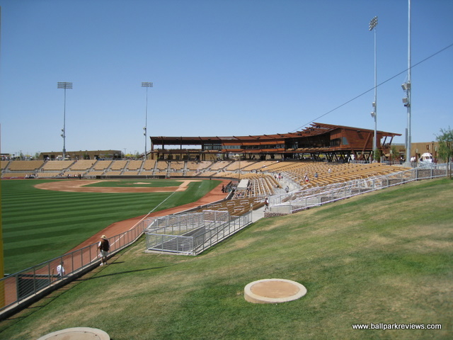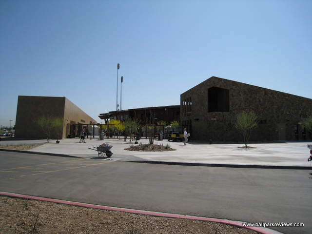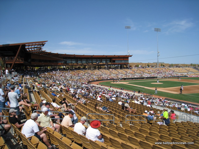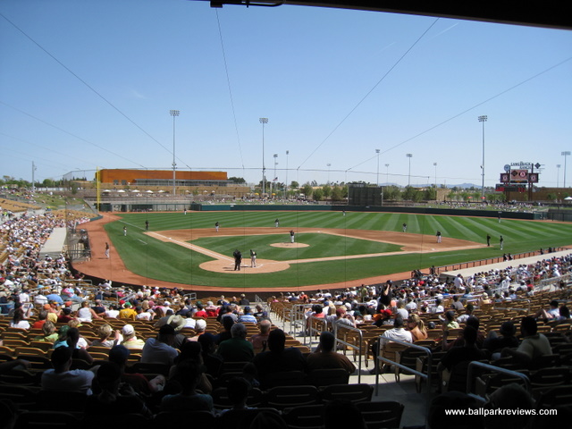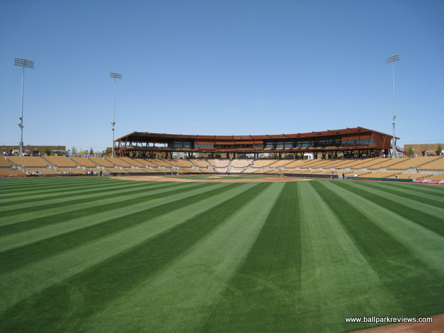 | Camelback Ranch is the brand new spring training home of the Los Angeles Dodgers and Chicago White Sox. And it is probably the most expensive ever built as it came in at a price tag of over $100 million. It is a facility that will serve both the teams and fans very well for many years to come and which will probably serve as a model for other new spring training facilities in the years to come. Laid out on a 100 acre lot of land, the entire complex has 12 playing fields plus the main stadium. Fans are allowed to wonder the complex and watch the players as they practice on the “back” fields. The stadium is among the biggest in Arizona as capacity is 10,000, though more can be accommodated on the large grassy berms beyond the outfield fences. It has a low profile from the exterior, but once inside it is very expansive. The main entrance is actually located in centerfield, right next to the main gift store. A wraparound concourse that is fully in view of the field allows fans to take in the action from many different angles. The “ranch” theme is used throughout the park, but is most noticeable in the look of the luxury boxes which appear as if they were constructed of wood. Seats are all of the fold down variety and are the same color as the seats in the first level of Dodger Stadium. Hence while the ballpark is shared by the White Sox, it definitely feels like the Dodgers are the prime tenant here. This is also noticeable in the fact that there is only one program available for purchase – a Dodgers one. Because of the expansive nature of the ballpark, many of the seats are a long ways from the field, especially those past the bags. Many different food selections are available including Mexican (burritos, tacos), Chinese (sobo noodles), brats, and garlic fries, though prices seemed a bit high and portions on the small side. In fact nothing will come cheap for fans here – from parking ($5) to tickets ($20 - $90) to programs ($5). But so far it has not stopped fans from coming out. As with most spring training venues, the atmosphere is very laid back. Ushers are friendly but unobtrusive and fans seem to be there to watch the game. Because the ballpark lacked any intimacy, I am not that enamored with it. However, the complex overall is great for fans as it allows them to get close to the players in a very relaxed environment. There is no doubt, though, that this ballpark served as a model for future other spring training facilities like those in Fort Myers and Mesa.