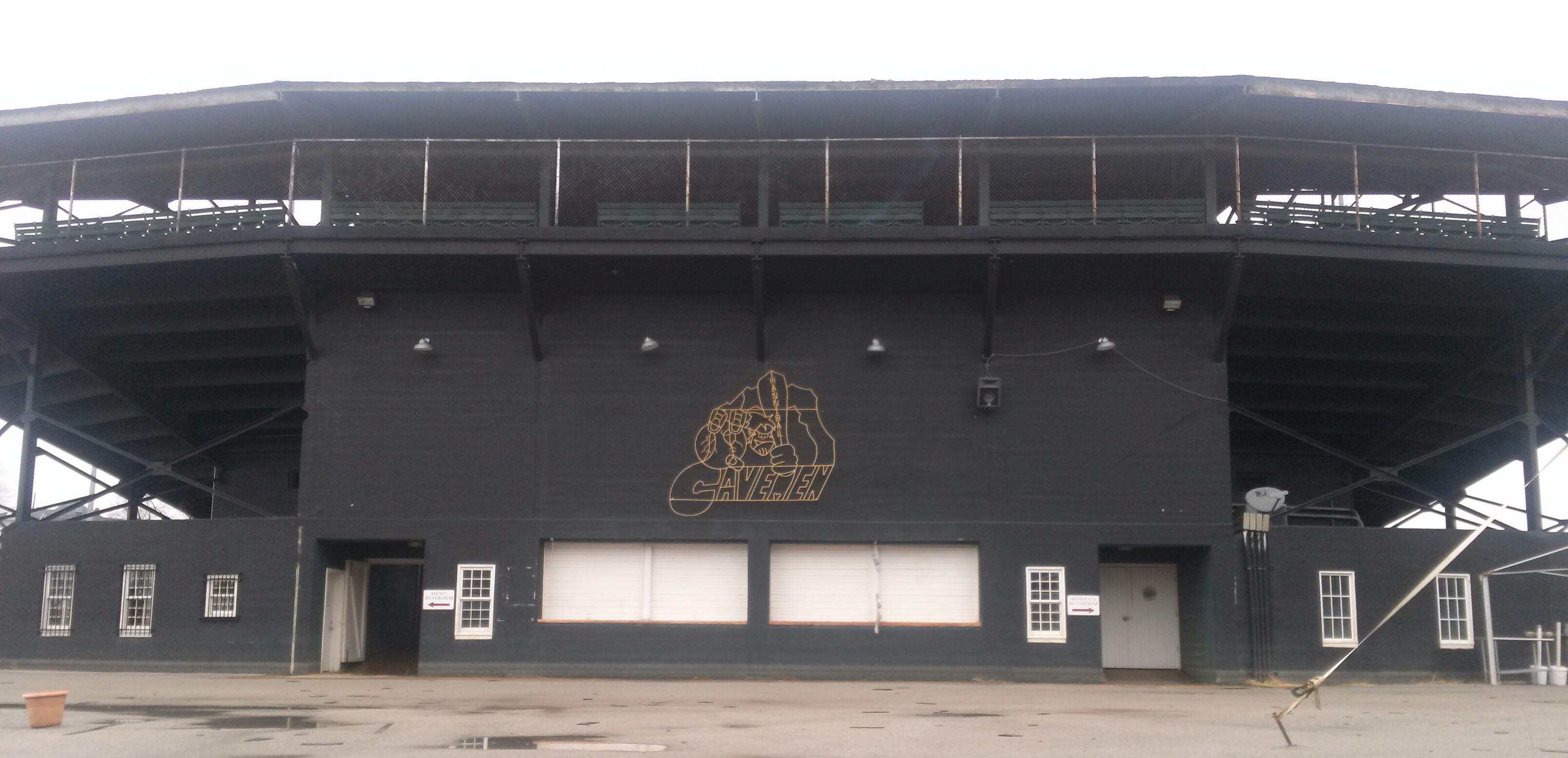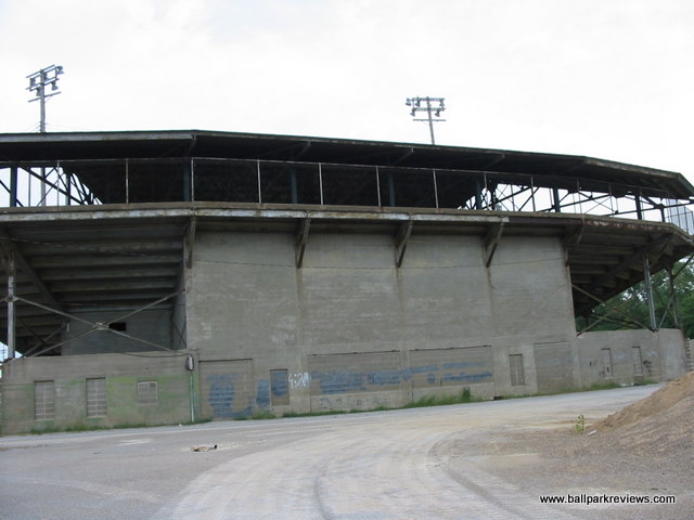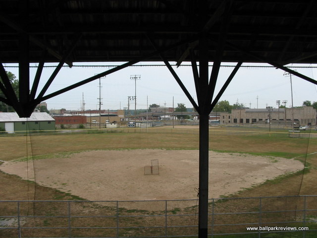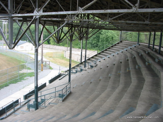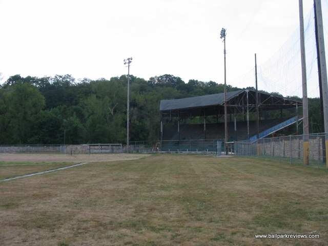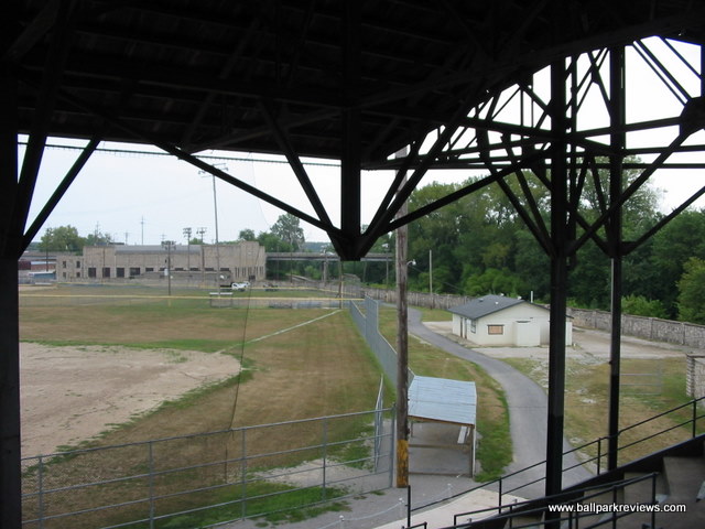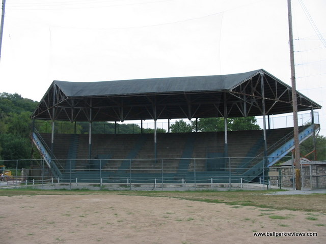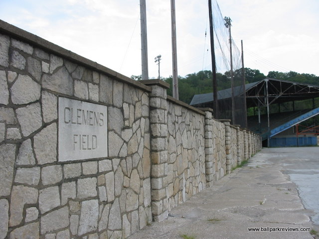 | Clemens Field, named after Hannibal resident Samuel Clemens, was host to a Midwest League team from 1952-55, but has not hosted professional baseball since. And before 2009, the ballpark had fallen into somewhat disrepair (as evidenced by the photos above). The field apparently hadn't gotten any use as the grass was brown and the infield was all dirt. But extensive renovations occurred here in 2009 upon the arrival of the Hannibal Cavemen, a team in the collegiate Prospect League. A new field was put in, real seats installed in the grandstand, and picnic areas built down the lines. From pictures I've seen, Clemens Field really looks fantastic now. The park is enclosed by a solid stone wall that is about 10 feet high. Story has it that prisoners of war were held here during World War II, which explains the need for the stone wall. It is always great to see an old park like this get a second life. While it will probably never host pro ball again, it is perfectly suited for a collegiate league team like they have now. Hopefully I will get here someday for a visit. For photos of the ballpark as it appears now, click the following links : Photo 1, Photo 2, Photo 3, Photo 4.
