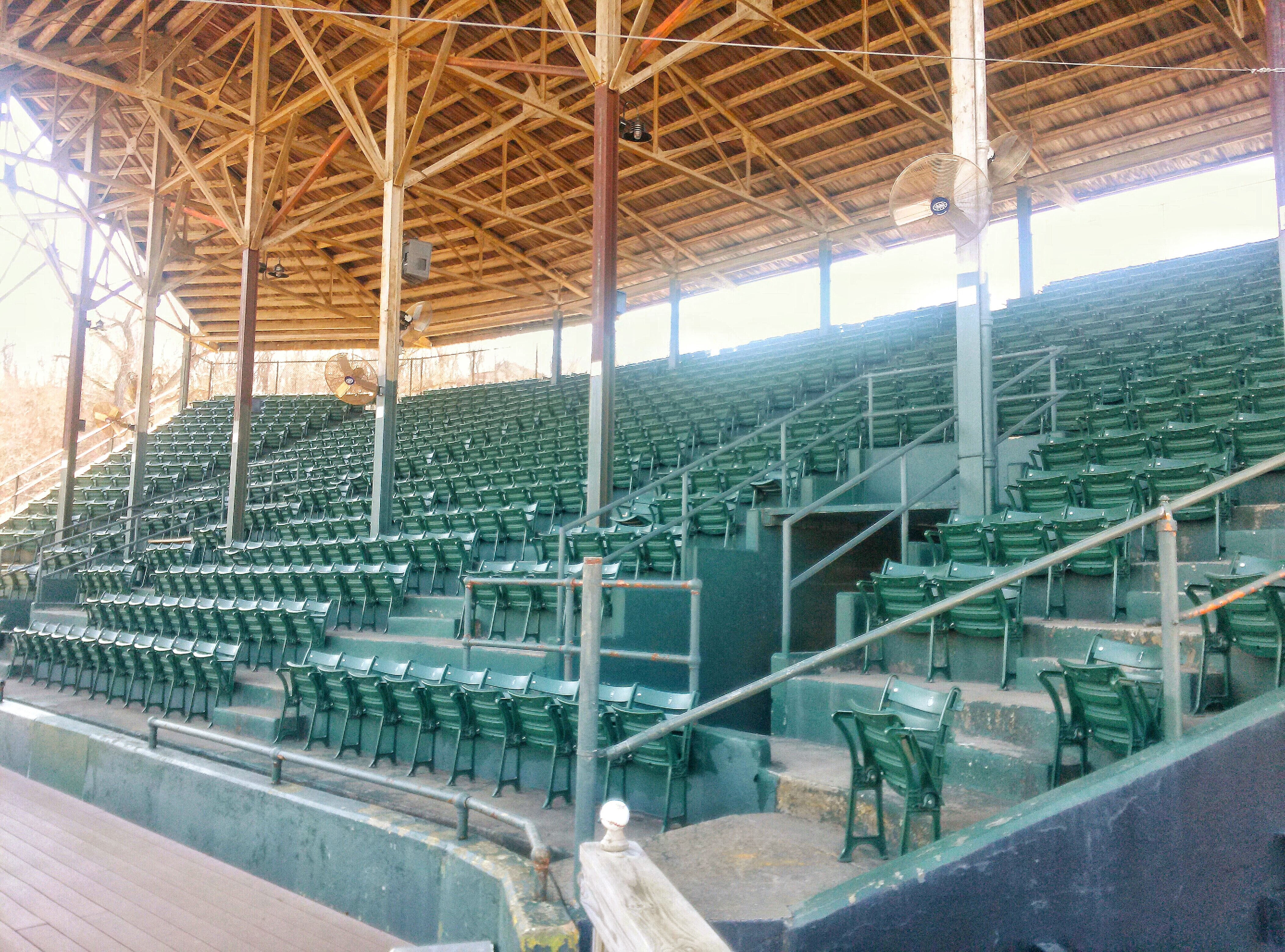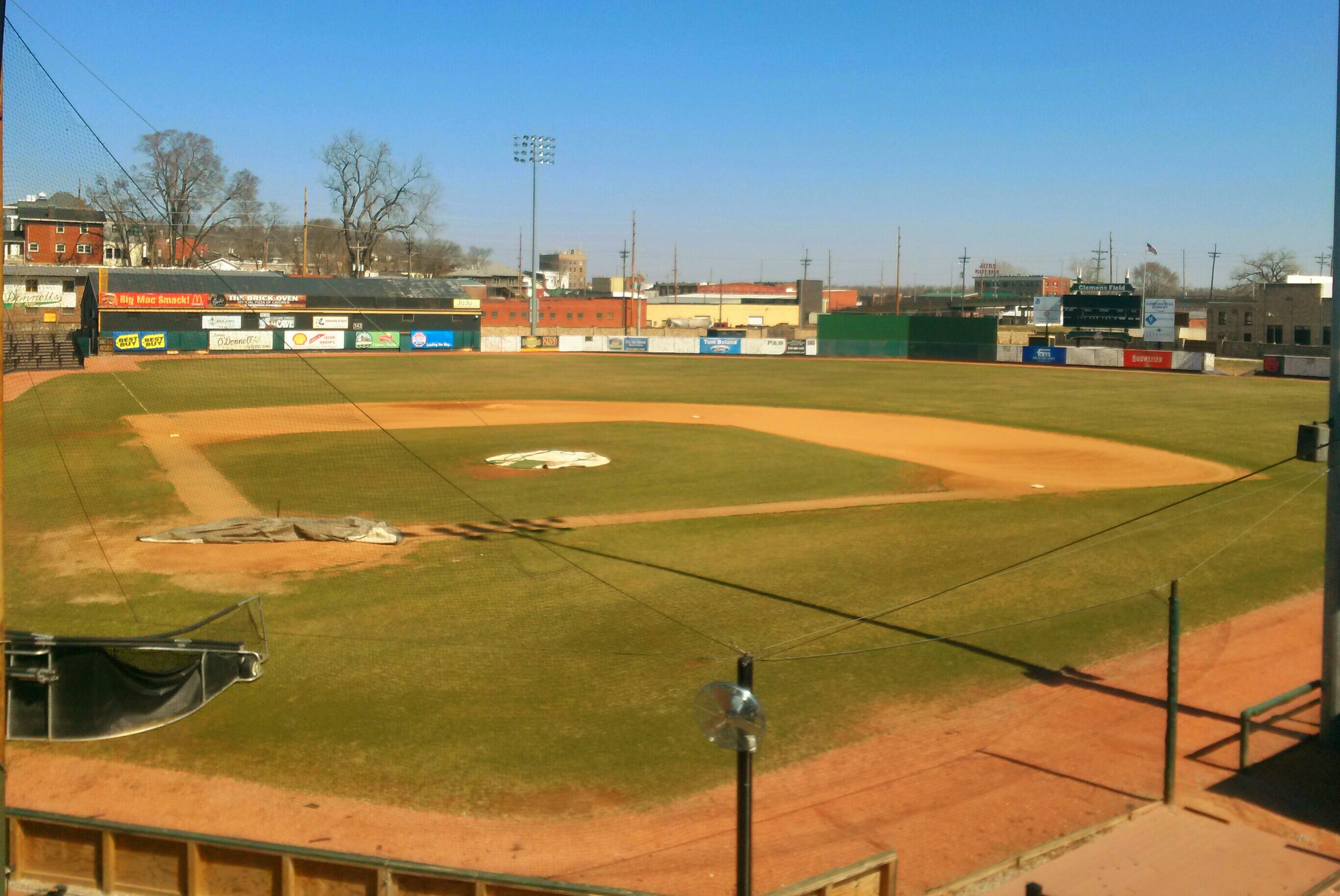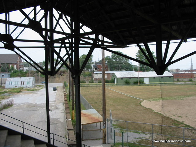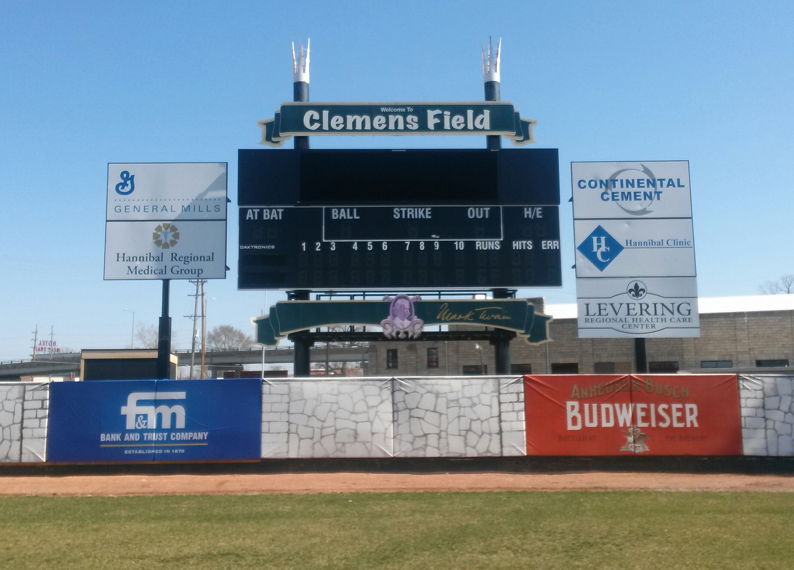 | Clemens Field, named after Hannibal resident Samuel Clemens, was host to a Midwest League team from 1952-55, but has not hosted professional baseball since. And before 2009, the ballpark had fallen into somewhat disrepair (as evidenced by the photos above). The field apparently hadn't gotten any use as the grass was brown and the infield was all dirt. But extensive renovations occurred here in 2009 upon the arrival of the Hannibal Cavemen, a team in the collegiate Prospect League. A new field was put in, real seats installed in the grandstand, and picnic areas built down the lines. From pictures I've seen, Clemens Field really looks fantastic now. The park is enclosed by a solid stone wall that is about 10 feet high. Story has it that prisoners of war were held here during World War II, which explains the need for the stone wall. It is always great to see an old park like this get a second life. While it will probably never host pro ball again, it is perfectly suited for a collegiate league team like they have now. Hopefully I will get here someday for a visit. For photos of the ballpark as it appears now, click the following links : Photo 1, Photo 2, Photo 3, Photo 4.