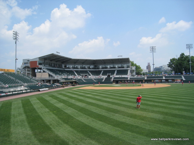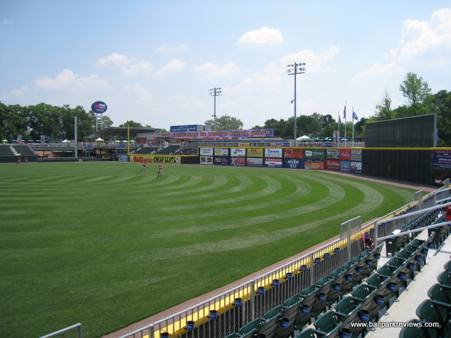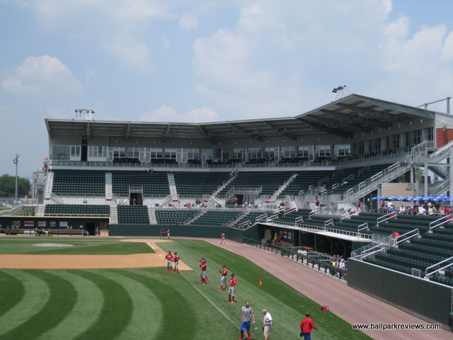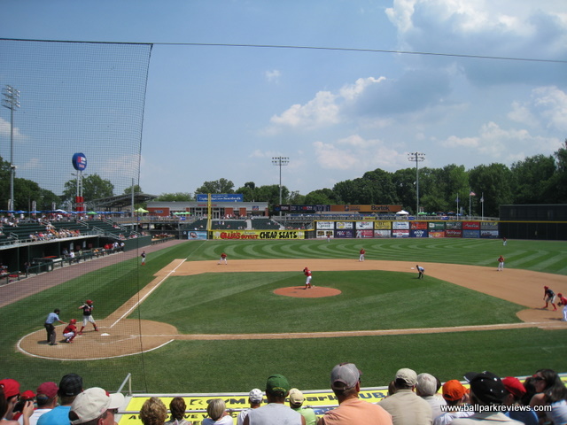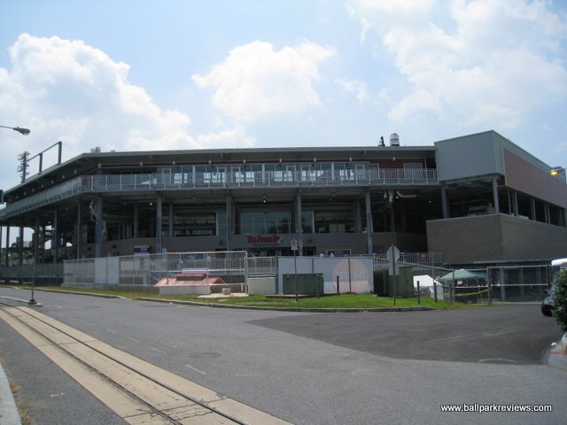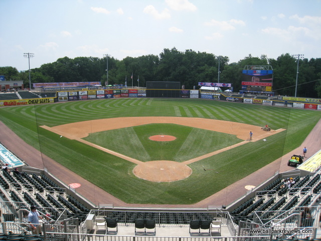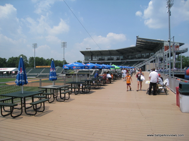 | The "new" Metro Bank Park (now known as FNB Field) opened in 2010 - it replaces what was originally know as Riverside Stadium (and in later years Commerce Bank Park/Metro Bank Park). While some may not consider this a different park, I am since the grandstand was completely torn down and rebuilt. The new park was actually built in two phases. Before the 2009 season, a new outfield concourse was added along with a high-def scoreboard. The second phase consisted of the new grandstand as well as a new building to house the ticket offices and team store. In total, the cost of this renovation was $42 million. A lot of money for sure, but Harrisburg now has a ballpark that is worthy of being called a AA park. Clearly the old park was one of the worst in the league. Metro Bank Park is probably near the top now. Its location on City Island makes for a very neat setting. While the old ballpark was never able to take advantage of this, the new ballpark does provide views of the Susquehanna River from the upper concourse as well the the back of the luxury suites. The rebuilt grandstand is a huge improvement over the old one. While still made of metal (I would prefer concrete), it features all fold down chairs and a roof that covers about half the seating. Also, they replicated the steep pitch of the old one, meaning that sightlines are excellent here. It puzzles me whenever people think that a steep seating bowl is a bad thing - the steeper the seats, the less obstructions there will be. In addition to the new grandstand, new box seats were put in down each line. The outfield concourse, which has a boardwalk feel, is the key feature that really separates this place from other parks. It includes several picnic areas, a row of bar stools in both left field and right field, as well as a couple sections of fold down seats. The lack of a grassy berm is actually a refreshing change. The only complaint I have with the seating is that they kept a single bleacher section on the first base side. While it does offer a cheaper seating option, it just seems a bit out of place in a new park. The concourse areas are also greatly improved now. The main grandstand features two concourses - one at ground level and one elevated. They both feature tons of concessions stands as well as places to sit amd enjoy your food. While neither are in view of the field, this doesn't matter to someone like me who rarely wanders the concourses while the game is being played. Concessions at Metro Bank Park are top notch. Not only are there numerous concessions stands, the variety of options is great and the quality outstanding. My favorite stand is "The Spot" (named after a now defunct Harrisburg restaurant), which features several specialty hot dogs as well as the "Rendell" Burger - probably the best burger I've ever had at a game. Other unique food choices include Philly cheesesteaks, BBQ (at MoMo's stand), and several types of sausages. Prices are quite reasonable for a AA ballpark. Because Harrisburg has had baseball since 1987, the atmosphere is pretty laid back here. Most fans seem to be into the game and the team doesn't try to distract the fans too much. There is an on-field DJ and the team does do a few between inning games, but there is nothing which interferes with the game itself. As part of the renovations, the team added a large play area (with several inflatables) for kids on the first base side. Fortunately it is out of view of the field, which is where these play areas always should be. Parking is available for $3 on the island, but is somewhat limited. So some fans park in the downtown and walk over the pedestrian bridge to get to the game. Overall, Metro Bank Park is just a huge improvement over what was here before. Harrisburg can finally be proud of the ballpark the Senators play in.