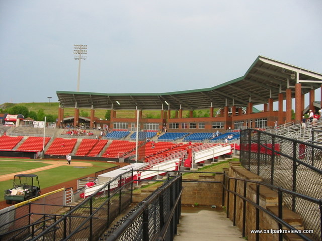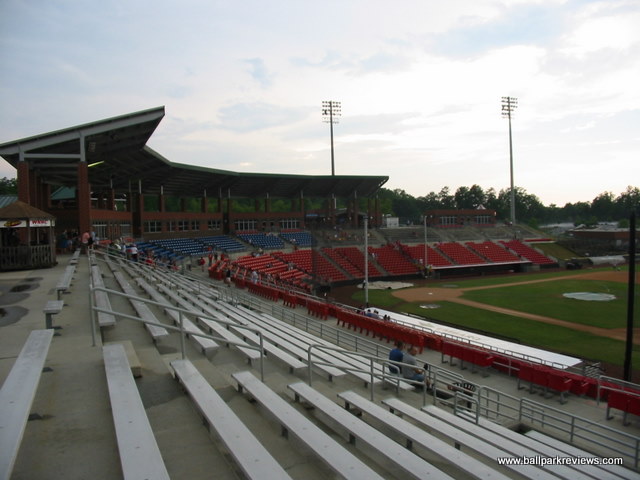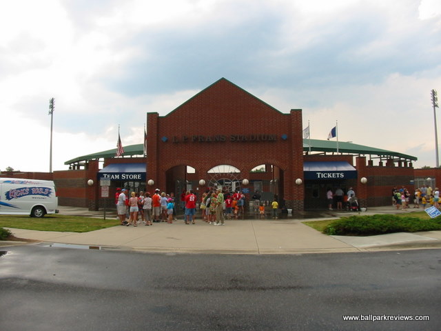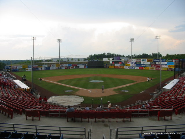| L.P. Frans Stadium is home to the Hickory Crawdads, a team that got a lot of attention in the mid 1990's because of their unique nickname. The ballpark is located on the outskirts of town near the city airport, on what appears to have just been forest land before. Now, a few other businesses have sprouted up nearby the ballpark, but overall the setting is unspectacular. L.P. Frans is a bit different than other 1990's parks as the luxury boxes are on the concourse level. Because of this, the concourse (which is completely uncovered) is not open to the field, meaning you will miss some action while getting concessions. The seating, which consists of both fold down chairs and benches, is split by a middle concourse. There's a large picnic area in left field and the Crawdad Cafe is located in right field. This cafe includes lots of outdoor seating, though nobody seemed to be using it the night I was there. A small cantilevered roof covers the luxury boxes and the back few rows of seating. Concessions here could be improved. With only two stands, lines were long before the game even started, and this was with only about 50% capacity. Unique menu items include the Carolina dog (served with chili and slaw), BBQ, and brats. Prices and quality were both average for the minors. The atmosphere at L.P. Frans is pretty much the standard minor league experience. A few between inning games were played (unique ones included the inner tube stack and an egg race with the mascot) and a mascot (Conrad Crawdad) is on hand to entertain the kids. Some music is played, but at least the team tries to find some different songs which match the player's names rather than using the same tired songs which have been in use for the past decade. Overall, L.P. Frans Stadium is a clean, comfortable, no-frills ballpark. It certainly doesn't match up to some of the newer SAL ballparks like those in Lakewood or Eastlake, but still it is very suitable for the level of ball being played here.