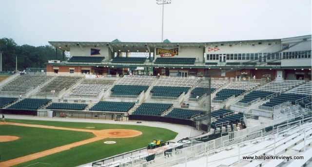 | Jackson, Tennessee seems like an odd location for a minor league team. Set in between two big cities (Nashville and Memphis), this rural city does not seem to have the population base to support a double A team. And this was clear the night I was there. Though attendance was listed as 2900, there wasn't much more than 1000 in the stands. The park itself is nothing spectacular. Built using a familiar template, you enter on the concourse which overlooks the playing field. Luxury boxes and club level seats reside over the concourse area. The seating is split between fold down chairs and metal bleachers (some with backs and some without). The abundance of bleachers give the park a rather cheap feel. A useless center concourse cuts the seating sections into two distinct parts. This center concourse pushes many of the seats further from the action than they need to be. A large picnic area with some games for kids is located deep down the right field line - not even in view of the playing field (the way it should be). A grill, featuring tasty cheese steaks and burgers is located down the left field line. A small souvenir store is located on the concourse behind home plate. The setting for Pringles Park (as it was originally called) is also unspectacular - it sits in the middle of nowhere right next to a highway. One annoyance here - they actually frown upon people taking flash photos while the game is going on. Overall, a serviceable double A stadium, but one that lacks any character. With the minor league restructuring of 2021, Jackson lost their team and it is unclear what the future holds for this park.