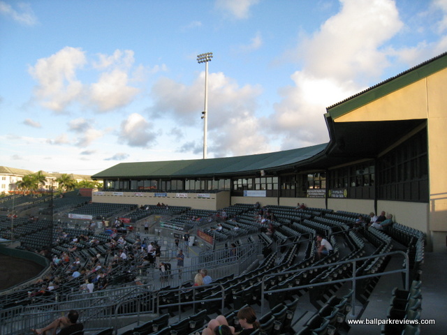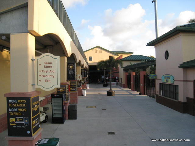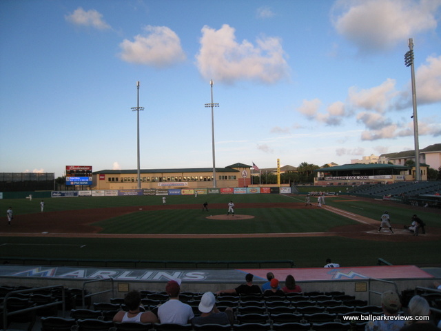 | Roger Dean Stadium is the spring home of the Marlins and Cardinals as well as serving as the home for two Florida State League teams (the Jupiter Hammerheads and the Palm Beach Cardinals). It is not identical to many other new parks that have been built since the late 1990's. The concourse area is located behind the seating bowl and is not within view of the playing field. Also, there are only a few luxury boxes. The location of the park, which was a bit strange when it first opened since it wasn't surrounded by anything, now sits on the edge of the main street and is surrounded by restaurants, condos, and shopping centers. The exterior of the park is beautifully landscaped with palm trees and features a nice red brick facade. The backdrop in both left and right field are the clubhouses. I was able to take in a couple spring training games here in 2000. It is certainly a comfortable place to see a game. But my biggest impression of the place was how expensive everything was. Parking and programs were both $5. Tickets were $15. Compared to other spring training facilities, Jupiter is way off. Maybe it was because the Cardinals trained here and it was at the height Mark McGwire's popularity. But I could have gone to Busch Stadium and see him for cheaper than in Jupiter. Despite the outrageous prices, Roger Dean Stadium is still one of the better Spring Training ballparks. In 2012, I got back here for a Florida State League game. Not much has changed with the ballpark other than its surroundings. Needless to say, the prices and experience at a FSL game are drastically different than those of a Grapefruit League game. Concessions are quite limited (only hot dogs, italian sausages, and brats are available) and the crowds very sparse. The great thing here in Jupiter is that you can see a game almost every day from March through August.