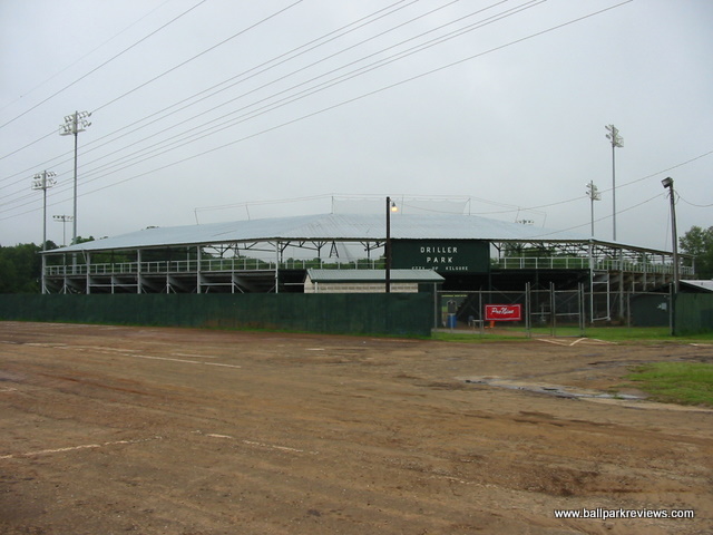 | Driller Park hasn't seen professional baseball since the 1950's, but apparently still gets plenty of use from high school and other amateur teams. Built in the heart of oil country, the grandstand is a vivid reminder of this as oil rigs adorn the exterior of the grandstand. Though the park would probably be suitable for an independent minor league team, the economy in the area is probably not such that it could support one. A nice historical marker, describing the history of Driller Park, was recently erected in front of the ballpark. After being home to the East Texas Pump Jacks, a summer collegiate league team for several years, it is now void of a permanent tenant. Unfortunately, I wasn't able to get inside to take further photos.