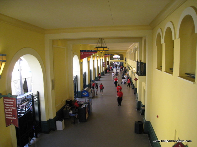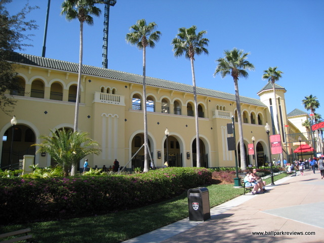 | Champion Stadium does not represent what a spring training atmosphere should feel like. Located in the ESPN Wide World of Sport's complex (which is part of Disney World), there is just too much going on besides baseball, which does not make for a relaxing or laid back environment. Fans can park for free in a large grassy lot, but the walk to the park is a but far. Also beware, egress after the game can be brutally slow. Despite the surroundings, I did like the actual park quite a bit. It is much more intimate than I expected, especially since it has two decks. Seating is made up of mostly green fold downs, but there are also some bleacher seats down the right field line and a large grassy berm which wraps from the third base bag to left center field. Most of the seats provide good sightlines as the pitch of the seating bowl is steeper than in some parks. One problem with the seating, however, is the lack of shade. Only the last few rows of the lower deck are shaded (due to the upper deck overhang) and while the upper deck does have a tressled roof, this really does not provide full shade. Champion Stadium does provide separate concourses for each deck, though the lower one is substantially more spacious. The lower concourse is also two sided, meaning that some of the concession stands are in view of the field. All concession stands have the same appearance, so you'll have to examine the menus to see what each offers. While walking the lower concourse, you probably will feel more like you're in a mall than a ballpark as everything is a bit too shiny. But I guess that's to be expected when you're in Disney World. Also to be expected is higher prices. And that's pretty much true as well. Tickets and concessions are both higher than other spring training parks. Food options include buffalo chicken sandwiches, pulled pork, sausage & peppers, and bacon double cheeseburgers. Unfortunately, none of these items (or hot dogs) can be bought separately - they all must be bought as part of a "basket", which includes fries. This just seems like a way to gouge fans. The quality of the concessions is average at best. Because this is Disney, I guess the Braves feel the need to go overboard with between inning silliness. While I don't mind a little of this, the onfield DJ, who seemed to be screaming the whole time, just made it even more annoying. Apparently she thought the fans were there to see her and not the game. One other small complaint about Champion Stadium - the area behind the right field fence is poorly used. There are small tents parking tents used for Braves coaches and players that litter this area and give it an unsightly feel. Couldn't they have found a better use for this space ? Overall, I do like the structure of Champion Stadium, but the atmosphere is just too "Disney-fied" for my liking. Unless you are a Braves fan or just want to get to every spring training park, I really can't recommend it. It now appears that 2019 will be the last year for the Braves here as they are planning to move to a new spring training facility in North Port. It is unlikely that another team would move here.