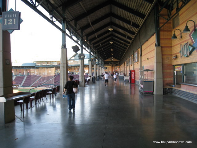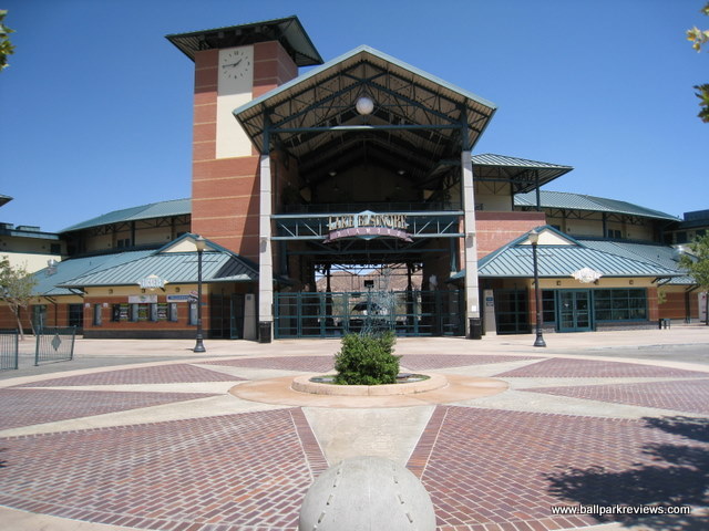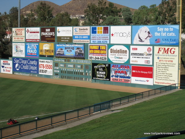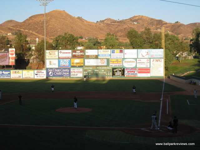| After reading some negative reviews about Lake Elsinore Diamond, I really wasn't expecting much going in. But I have to say, I was pleasantly surprised, and my visit here was probably my favorite among the parks I saw on my California trip in 2008. The beautiful exterior hits you right away when you arrive. The grounds are immaculately groomed and there are two sculptures, one of a hitter and one of a pitcher, which both light up at night. Upon entering the park, a stunning view of the surrounding hills is the first thing you'll notice – something that is distinctly Californian. The concourse which you enter onto is open to the field and is very spacious. The roof overhead is one of the tallest you'll ever see at a minor league park. Because of the high roof, tall pillars are needed to hold it up, another unique feature of the Diamond. The concourse is kept shiny and very clean, though it is not as lively as it could be. Several concession stands were shut down giving the park a slightly depressed feeling. The seating bowl consists of all maroon fold downs with plenty of legroom and excellent sightlines. Because of the steep pitch of the seats and the fact that there is no center concourse, sightlines are about as good as you can get. Overflow seating can be accommodated on the large grassy berm in the right field corner. Directly above the berm is a picnic area. In the left field corner, there is a large restaurant called the Diamond Club. It is very classy looking and has lots of glass windows for patrons to see the game out of. Concessions at Lake Elsinore Diamond are average at best. The variety is lacking, quality is below average, and prices seemed a bit on the high side. As already mentioned, a few of the concession stands were closed the night I was there, so perhaps the variety is better on busier nights. The team has been having some financial issues in recent years, so perhaps concessions is one area they feel they can make some money. As for the atmosphere, it was much better than I expected. I had heard it would be over the top, but was really not too bad. The team only did a couple between inning contests : race the mascot, bungee pull, and a golf game. There was also a couple of “skits” featuring a dancing gorilla, which apparently is a fan favorite. The Storm have two mascots, one of which is a pink bunny named Jackpot who pops out of the scoreboard whenever the home team scores a run. The only negative aspect about the atmosphere is that the sound is cranked a bit too loud, especially when the Storm are up at the plate. Another unique aspect to this ballpark is the manual scoreboard in right field – a very nice touch that I always appreciate. One other small complaint – parking is $5, which is a bit steep. On the plus side, programs are free. Lake Elsinore Diamond is definitely unique and memorable, which is probably why I enjoyed my visit so much. Some improvements are needed in the area of concessions, but otherwise this is a fine place to see a game.