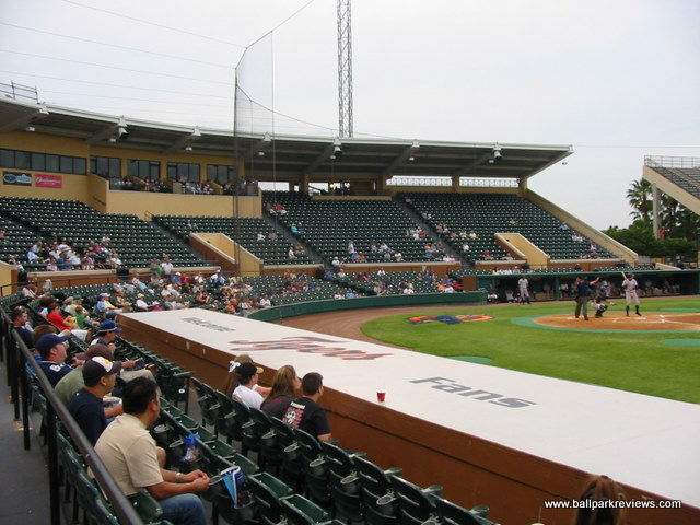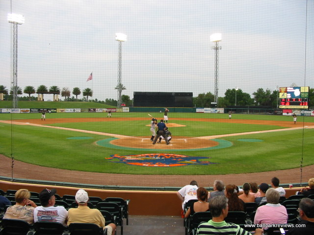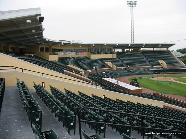 | After attending games in Clearwater and Tampa the previous day, taking in a ballgame at Joker Marchant Stadium was a refreshing change. Situated in a residential area away from the busy strip, the laid back atmosphere is how a spring training park is supposed to feel (even if I was attending a Florida State League game). Having never seen the park before the extensive renovations in 2003, I can only assume that the park has been enhanced greatly without losing much of its charm. A tan stucco exterior meticulously landscaped with palm trees is the first thing that catches your eye. And the interior is just as nice. The main seating bowl consists of all green fold down chairs, split by across aisle which leads to the concourse. A large bleacher section along the third base line and a grass berm behind the left field fence complete the seating, though these are off-limits during the minor league season. The concourse is located behind the grandstand, out of sight from the field. It contains numerous concession stands and kiosks, most of which are not open during the FSL season. With the nickname change to "Flying Tigers", the Lakeland franchise has embraced the military theme. This can be seen in the concession options (i.e. the "torpedo" dog) to the names for the stands ("Mess Hall"). Also, the night I attended, all the game day personnel were dressed in fatigues. One odd quirk of the ballpark is the large fence that has been erected in front of the first base stands. Apparently this was put in to protect fans from overthrows as the seats are especially close there. But how many overthrows from infielders go into the stands ? Not many that I've seen. This seems like a lame excuse to obstruct the views of these otherwise great seats. Compared to other FSL parks, concessions at Joker Marchant are well varied and quite tasty. They include italian sausages, burgers, and chicken sandwiches. The atmosphere of the park matches the peaceful setting. While some between inning games are done (race the mascot, dizzy, t-shirt toss), there are no blaring sound effects and all music that is played is old-timey. The team does have a mascot, Southpaw, but he only made one brief appearance. Like most of the FSL teams, Lakeland does not draw well. But even without many fans in the stands, I enjoyed the atmosphere a lot more than in other places like Sarasota and Tampa. Joker Marchant Stadium is just a charming place to take in a game on a summer evening. In 2017, another major renovation was completed which includes the demolition of the large bleacher section down the left field line. This reno will ensure the Tigers train here for many years to come.