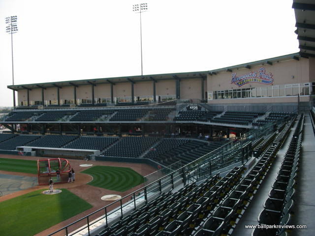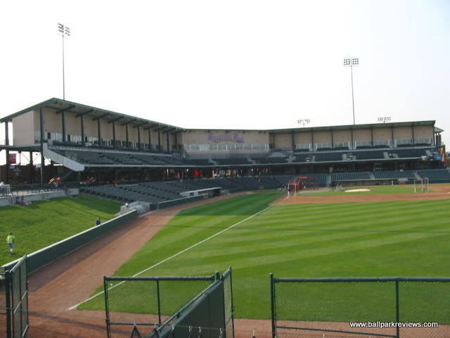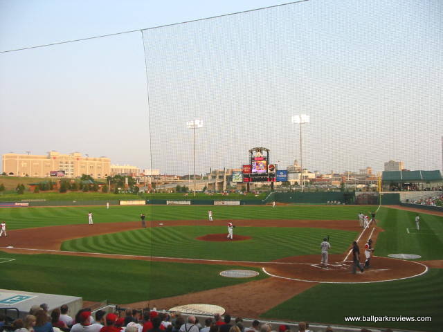 | Haymarket Park is like a smaller version of Victory Field in Indianapolis. It uses a familiar template, but includes a small upper deck, which really distinguishes it from other new parks. The park has a great location as it overlooks Memorial Stadium (where Nebraska plays their football games) and the Lincoln skyline, including the state capitol. The concourse is open and wraps all around the park, meaning there are plenty of grassy berms for overflow crowds. Sightlines are great - the lower level seats are very close to the field, and even the upper deck seats don't feel like they are too far from the action. The luxury boxes are located at the top of the upper deck. Concessions are well varied and very reasonably priced. Their specialty item is the Runza, which is a sandwich stuffed with meat and spices. Apparently Runza is a restaurant chain in Nebraska. I enjoyed the atmosphere of Haymarket Park quite a bit. There were very few sound effects and the musical selections included some organ music. Instead of between inning contests, the team loves to shoot hot dogs into the stands. I guess they need to justify the money they spent on the huge shooter used to launch the hot dogs. The team has a mascot, "Homer", but he wasn't around much. Parking is plentiful and free. Overall, Haymarket Park is a refreshingly different park with a very nice setting and a relaxing atmosphere. Certainly one of my favorites.