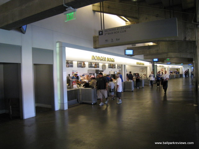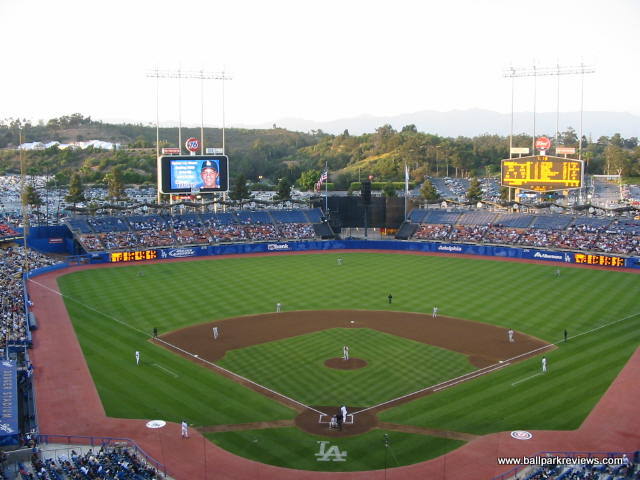 | If you want to see all of Dodger Stadium, it will probably take you multiple visits since the Dodgers really don't urge fans to explore the park. In fact, fans are supposed to stay on the level where their seats are. Now that I've been to Dodger Stadium twice and seen the main level, I can confirm that this is a fine ballpark and one that has held up well to the test of time. I'm not exactly sure of the reason why fans are not allowed in every area of the ballpark , but one explanation could be that they want to protect all the Hollywood celebs from being hounded by regular fans. Whatever the reason, it gives Dodger Stadium a very elitist feel. The stadium is set to the north of the city on what was previously a landfill. The exterior of the stadium is well landscaped and features large murals of Dodger greats to celebrate their 50th year in Los Angeles. Parking, which used to be confusing to navigate and which created some big traffic tie-ups after the game, has been greatly improved in 2008. It will cost you $15 to park, but the egress is now now very easy. Even with a large crowd the night I attended in '08, I was out of the parking lot within 15 minutes. To discourage tailgating, parking lots only open 2 hours before the game. Despite being over 40 years old now, it is still a good place for seeing a ballgame. Sightlines appear to be good from most angles and the upper decks do not feel nearly as high as in the newer parks. Most of concourses are open to the playing field, which is certainly a rarity in such an old park. The nicest concourses (not surprisingly) are located on the field level, though they are a bit narrow. With large crowds, they can be tough to navigate during the game. In the area of concessions, there is a great variety of options, but because this is Southern California, prices tend to be on the high side (i.e. $5.75 for a bottled water). The infamous Dodger Dogs are grilled, but rather bland in taste. Other concession options include Subway, Mexican, Carl Jr's, California Pizza Kitchen, Chinese, sausages, and garlic fries. The atmosphere is interesting as Dodger fans are famous for showing up late and leaving early. Though I really haven't noticed that too much on either of my visits. During my '08 visit, the fans, though a bit belligerent at times, were mostly into the game. The setting for Dodger Stadium is gorgeous as it is surrounded by the Elysian hills and the San Gabriel Mountains. The Dodgers have to be commended for keeping the ballpark in great shape – it really does not look anywhere near its age. And they are planning on pouring another $500 million in renovations into it that will be completed by 2012. Dodger Stadium is certainly a great place to see a game, but I just wish they would make it a little less restrictive.