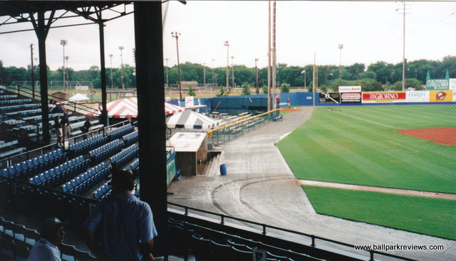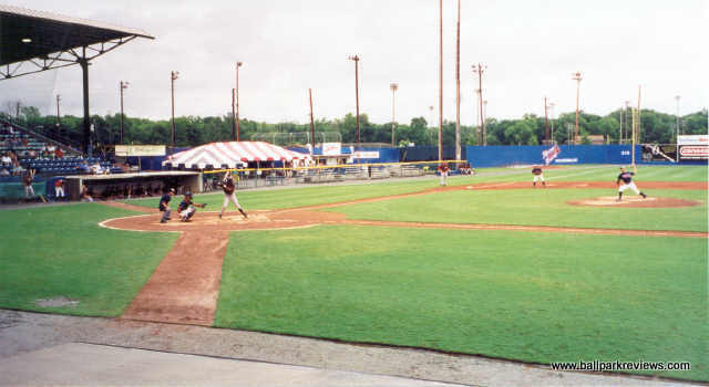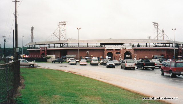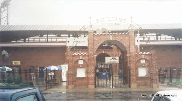 | Luther Williams Field must look very similar to when it was built 70 years ago. The original covered grandstand still stands, though a new tin roof has replaced the wood. An old black iron gate surrounds the field - the front of which says "Macon Base Ball Park". This is a real gem of a park. The day I attended a game here it was rainy so I probably didn't get the full experience. But I enjoyed the park, nonetheless. The majority of the seating is located under the grandstand behind homeplate, while there is limited seating down the lines on small aluminum bleachers. A picnic area is situated past third base down the left field line. The uncovered concourse area is in between the iron gate and the grandstand. It contains 2 main concession stands as well as a few other small ones offering such items as french fries and ice cream. A small souvenir stand is also located in the concourse. There are 5 rows of box seats that are very close to the action, while the rest of the seating under the grandstand is benches with backs. Certainly the box seats are preferable here, and only about a $1 more than the GA seats. There were no between inning promotions, and very few sound effects. But I'm not sure that this is the norm, as it was a rainy day with very few people in attendance. And surprisingly, no mascot - one of the few teams left without one. Hopefully they don't change a thing here, because it is one of the most beautiful small parks that I've seen. Unfortunately, the Braves left after the '02 season for Rome. Since then, Macon has had a couple opportunities with pro ball as the Macon Peaches of the ill-fated Southeastern League played at Luther Williams in '03 and in 2007, it was home to the Macon Music of the upstart South Coast League. Unfortunately, the team and league only lasted one season.