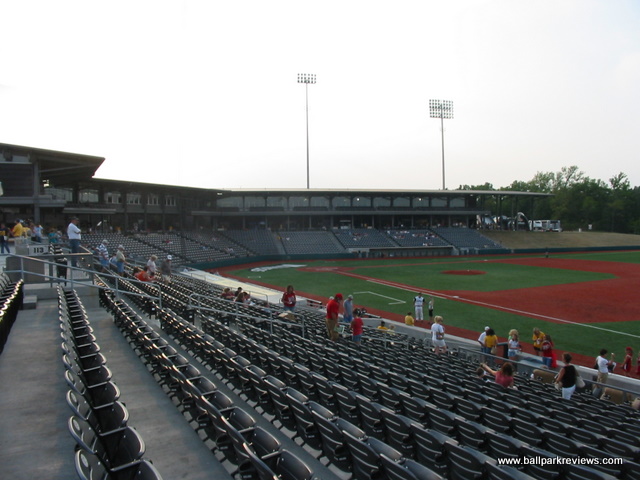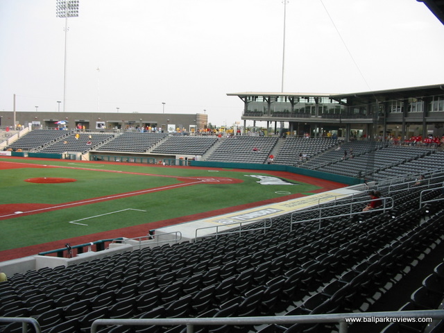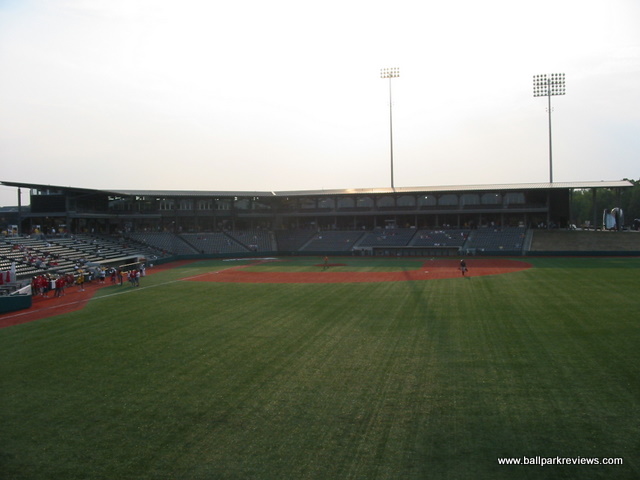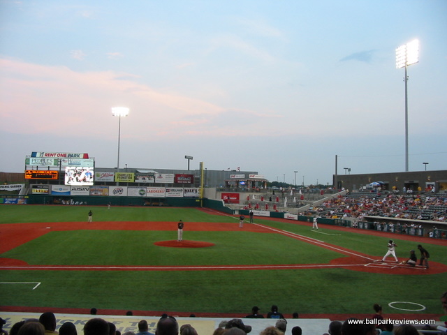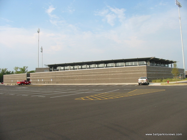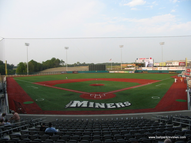 | If you like artificial turf, then you're in for a real treat when you visit Rent One Park. Not only is the grass fake, the dirt is also fake. That's right - the baselines, the pitcher's mound, the home plate area, the warning tracks. All artificial. It certainly makes for a different experience while watching the game, and probably not one I'd like on a regular basis. Once you get past the fake field, however, Rent One Park is a fine new ballpark. It is located in a growing commercial area, west of the city of Marion. Because it was built in a big empty space, there is no backdrop to speak of. The exterior of the park is a rather boring gray brick with no signage indicating what the name of the park is or who plays there. Inside, the design of Rent One Park follows the common template used nowadays with an open concourse overlooking the field and luxury boxes stacked overhead. The concourse is very wide and spacious, though there seems to be too much dead space on the third base side. Currently the concourse does not wrap all the way around the ballpark, but it clearly could at some point in the future. Seats are all of the green fold down variety, with season ticket holders getting cushions with theirs. Picnic areas are located in center field and in the right field corner. There is also a grassy berm in left field, though when I visited in late August, the grass was completely brown. Perhaps the team has no way of watering the grass since they don't have to worry about the field needing water. Maybe they should just put artificial turf in the grassy berm as well ! A large gift store is located off the concourse and typical of most first year teams, prices were quite high on most items. The team does give out free scorecards, however, which is a nice touch. Concessions is one area that could probably be improved on. The overall variety was rather limited and the quality was average at best. I always like to see teams have a signature food item, but there are none to be found in Marion. The atmosphere, as with most teams in their inaugural year, is a bit over the top. The music is cranked too loud and the PA announcer is a bit too enthusiastic. There are also four mascots (a miner, a bird, a mole, and TNT) on hand to entertain the fans, which they did quite well. Also, the team does a few of the typical between inning games. Certainly the fans of Southern Illinois have taken an immediate liking to Rent One Park as they easily broke the Frontier League attendance record in their first season. The ballpark doesn't break any new ground or have any unique features (unless you're fond of the artificial turf), but it's a comfortable and pleasant place to take in a game.