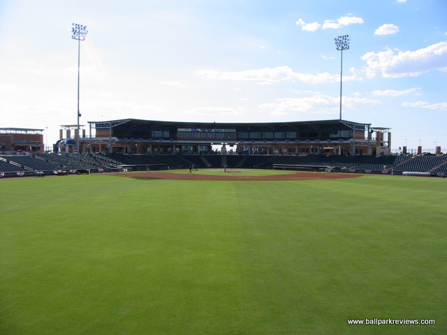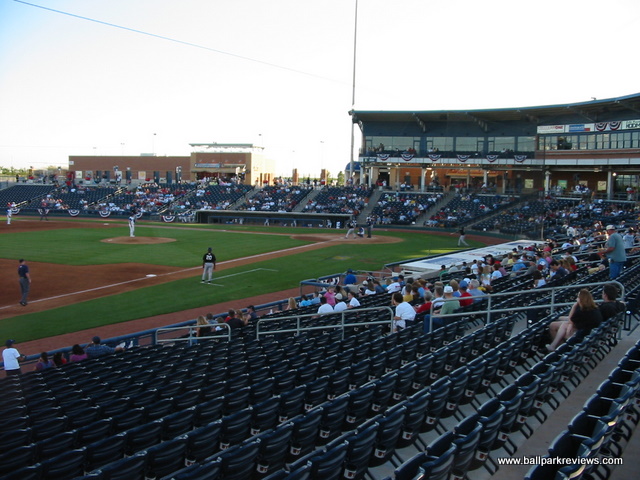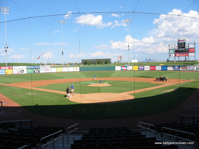 | Security Bank Ballpark is a nice enough new ballpark, but one that simply failed to excite me. Maybe it's because the setting is so boring. Or maybe it's just because it follows the same template that dozens of other new ballparks have followed. It is set on the west side of town in a big parking lot next to a football stadium that was built at the same time. Both have nice brick exteriors that complement one another well. Inside, fans enter on the concourse level which overlooks the field. Luxury boxes are stacked over the concourse and a roof extends over the suites as well as the last few rows of seating. Seats are all fold down blue chairs. While all seats are close to the field, almost all sightlines are obstructed by the netting which runs to the end of each dugout. As is becoming customary at new parks, the concourse circles the entire park allowing for grassy berms for fans to sit on during the game. Because there were no space restrictions, the architects made a wise decision to set some of concession stands back from the concourse. This serves the dual purpose of relieving congestion and allowing the winds to move through the ballpark and cool it off some. Unfortunately, the architects also got a bit too cute in places, i.e. the bullpens create juts in the outfield fence that are unnecessary and feel purely contrived. Concessions at Security Bank Ballpark are quite good - prices are cheap and the quality is above average. Selections include BBQ, pizza, Mexican, and Chick-Fil-A. In addition to the usual concession stands, a restaurant (which is open to the public) is also located behind homeplate. The atmosphere in Midland is an interesting one - fans seemed to arrive late, but once they showed up they were very vocal. The team used the typical between inning contests to entertain the fans - Race The Mascot, Dizzy bat race, Let's Make A Deal, etc. Overall, First American Bank Ballpark is a pleasant place to see a game, but I found there was little to distinguish it from numerous other new parks.
