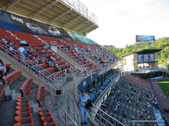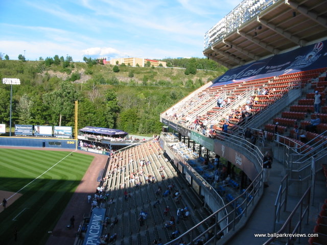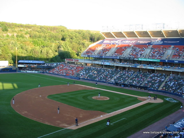 | PNC Field (formerly Lackawanna County Stadium) was very similar to Coca-Cola Field in Buffalo in the way it feels more like a major league stadium than a minor league one. The comparisons end there. There is little I really like about this park. It is set at the bottom of a mountain with just one road in and one road out which makes for a difficult exit, though road improvements over the years have made it better. Hope for a Fireworks night, and get out as soon as the game ends. One of the few double-decked stadiums in the minors, many of the seats are just too far away from the action. The lower level seats are fine, but the upper deck seats feel a ways from the action and many do not offer good sightlines. It used to be possible to get GA seats on the first level that were better than the upper deck seats, but with the arrival of the Yankees as an affiliate in 2007, those seats were removed. As part of renovations that were completed before the '07 season, the top several rows of the upper deck were removed and advertising banners placed in the dead space. These seats were moved to where the GA seats had previously been. The biggest negative of PNC Field was also corrected in 2007 with the removal of the artificial turf that had been here since the park opened. Natural grass gives the place a much more pleasant feel while watching a game. The concourse area, located behind the seating areas and out of sight from the field, has an good selection of food and concessions as well as a bar/restaurant. Some of the unique food items include Philly cheese steaks, gyros, and pierogies. Prices here had always been pretty low, but seem to have gone up a bit with the arrival of the Yankees as an affiliate. Fortunately the parking and scorecards are still free. Strangely the team has no yearbook or program for sale, though. PNC Field's location at the base of high rock ledge actually makes for a pretty setting, though the view is more and more of new businesses that are being constructed on the mountain. The installation of real grass certainly makes this a better ballpark, but it still feels too big, especially when you're stuck sitting in the upper deck. But fans don't seem to mind as there has been a baseball renaissance in '07 in Scranton. Attendance was up significantly for a couple of years, but by 2011 it had fallen off dramatically. Fortunately, a major renovation is now planned as the Scranton-Wilkes Barre Yankees will play all their home games in alternate parks during the 2012 season. The new park is scheduled to be ready for the '13 season.