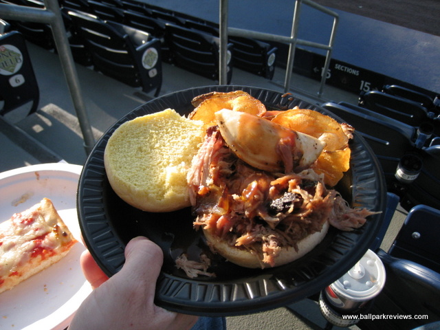 - A BBQ stand, located in the right field corner, has both pork and beef sandwiches as well as perogies. I sampled the Perogie Pork sandwich ($7.50), which was quite tasty.