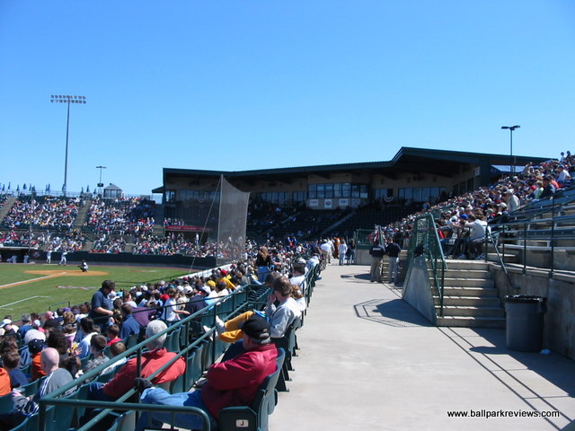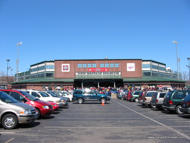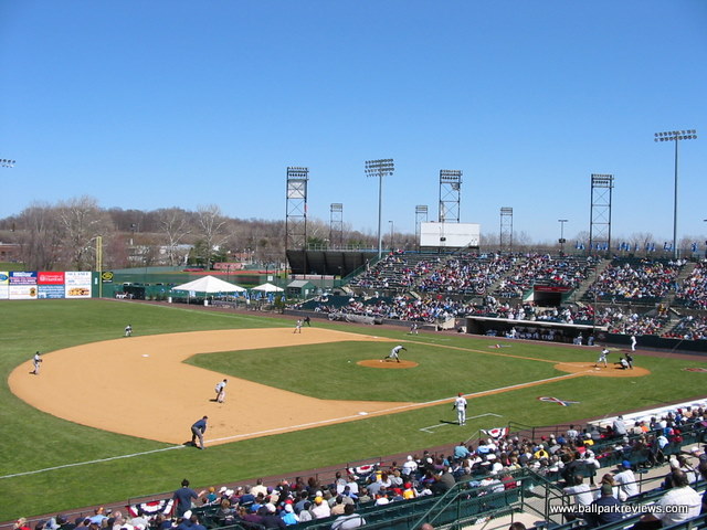 | New Britain Stadium, which replaced Beehive Field (still standing right next to it) in 1996, is actually a bit different from other new parks built in the late 90's, but is completely void of any character or charm. It most resembles Binghamton's Municipal Stadium because of the location of the concourse. It has a minimal amount of covered seating, but a very spacious concourse area (which runs underneath the seating) where fans can take cover in case of rain. The box seats are quite roomy, though strangely they are not all fold downs - the last two sections down both lines are plastic bucket seats. The reserved seats are also bucket seats while the general admission section consist of benches with backs. Concessions are pretty ordinary and priced on par with other double-A stadiums. A small gift shop in also located in the concourse area. A nice scoreboard sits in left field. It is a bit annoying however as graphics seem to be moving the whole time on it. They have the typical between innings contests along with a mascot (Rocky) who roams the stands bothering people. Parking is plentiful, but the price is a bit high at $3. My only complaint is the lack of $1 scorecards which they got rid of for the 2001 season. They now only have $3 programs. I would rank it in the middle of the pack among Eastern League parks. New Britain Stadium is a comfortable enough park, but one that is mostly unmemorable. In the summer of 2014, it was announced that a new ballpark would be built in nearby Hartford for the Rock Cats. In 2016, the Rock Cats did move and became the Hartford Yard Goats. But the Atlantic League quickly swooped in and put a new team, the Bees, in New Britain Stadium for the '16 season. The Bees lasted four seasons before being turned into a collegiate league team in 2020.