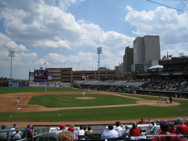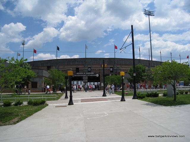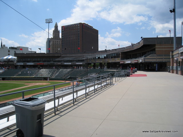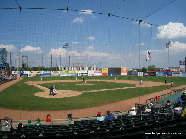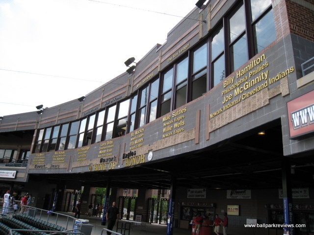 | Bears and Eagles Riverfront Stadium is a great example of why downtown parks work so well. Because it was tucked in between 4 streets, it allows for some oddities that make this a much more interesting park than those that are built on open pieces of land. The park is built in the typical fashion of other 6000 seat facilities with the concourse overlooking the field and the luxury boxes above the concourse. But because of a couple of differences, I like this park more than those in Somerset and Long Island. First, the press box is not on the concourse level - this allows the concourse area to have a much more open feel to it. This also means that you can see the game from anywhere on the concourse. Secondly, there is no unnecessary middle concourse like at EAB Park or Campbell's Field. This allows for more seats to be close to the action. Because the park had to be tucked into its setting, there is little foul territory making the seats quite close to the field. The scoreboard is located in right field and features a very sharp video screen. And the Bears use it for more than just advertising. The concessions, which had been well varied and of decent quality, seemed to have a taken a significant downturn. On my 2008 visit, I noticed that pretty much only the standard ballpark fare (hot dogs, sausages, popcorn, cracker jacks) was offered - no chicken, no Dippin Dots, no fried dough. Also, the employees working the concession stands seemed incompetent and indifferent to customer service. A large gift shop is located behind home plate and features a ton of Bears merchandise as well as a small Newark Bears Hall of Fame. The backdrop is interesting in all directions around the park. There are tall buildings behind the first base side. A bridge is in view over the left field fence. And the Manhattan skyline is visible in the distance in center field. The parking situation, which was poor the first few years, has improved with the building of a large parking garage just past the right field corner. The price ($5) is a bit high for the minor leagues, but acceptable given the downtown location. The atmosphere here is pretty typical of minor league parks, though they do a couple of unique between inning contests. Their mascot, Rippin Ruppert, is one of the harder working mascots you'll find. This should be a good place to see a game - it is intimate and the setting is interesting, but for some reason, the overall experience has gone downhill in recent years. Upkeep on the park seems to be lacking and the concession situation is a mess. Attendance has never been great (and probably never will be), but hopefully baseball can remain here. Unfortunately, after the 2013 season the Newark Bears folded and there was never professional baseball played here again. In the spring of 2016, the ballpark was sold to a developer who planned to tear the ballpark down to make room for apartment and office buildings. Such a shame that a nice ballpark like this had such a short lifespan.