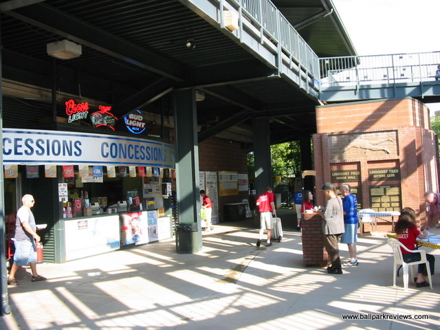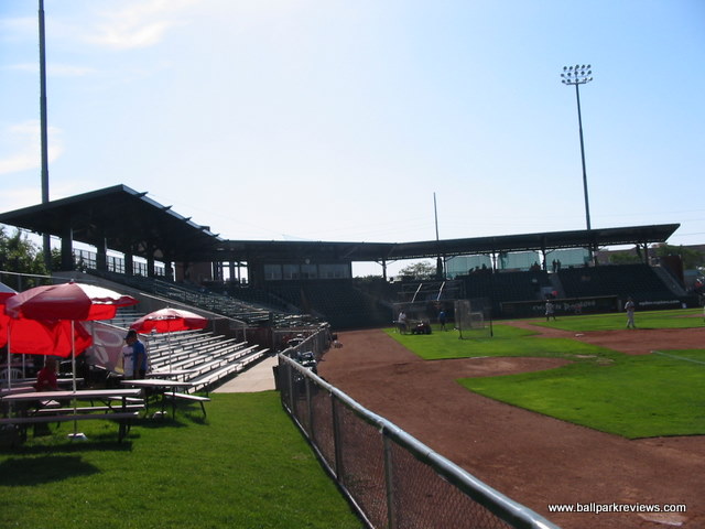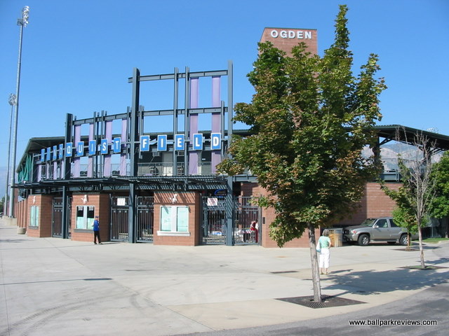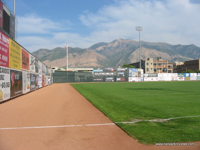| In terms of settings, ballparks don't get much better than Lindquist Field. Being in Utah, where there are numerous mountain ranges, this is not surprising. The closeup view of the surrounding mountains combined with the downtown location make the setting almost perfect. And the ballpark itself isn't too bad either. It features a large grandstand full of box seats with a roof to cover the last several rows of seating. There are also metal bleachers down each line, though these feel a bit detached from the main grandstand. A small grassy berm in the right field area completes the seating. The seats are close to the field, but netting setup all around the field obscure the views a bit. Unlike other new parks, the concourse is not located in view of the field. Instead, it is located behind the grandstand. It is covered and features several concession stands. There is also a picnic area in the left field corner which serves concessions. Food options include burgers, sausages, chicken, and Mexican. The quality is good and the prices reasonable. Unfortunately, the prices were not as reasonable on everything. Reserved tickets are $8 and programs are $5, both of which seemed a little high for the Pioneer League. Curiously lacking is a team store. Instead, there is just a stand along the concourse which offers team merchandise. The ballpark and setting I liked a lot. But I did not care for the atmosphere. While the team did the standard on field games, there were too many annoying sound effects. Also, the fans seemed passionate, but some of their chants were childish and got old by the 3rd inning. Another complaint I had was with the ushers. Besides their ugly outfits (bright orange vests), they were also a bit too aggressive in ticketing people. But overall, these were just minor complaints. The splendid setting (especially as the sun sets) dominates the experience for me. Bottom line, Lindquist Field is just a really cool place to take in a game.