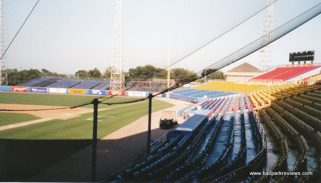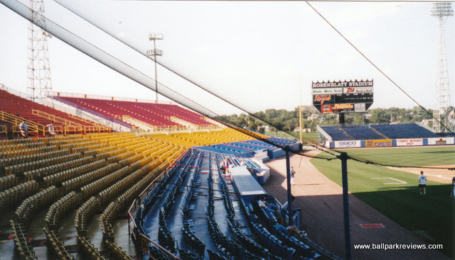 | Rosenblatt Stadium is probably best known for being the home of the College World Series, but it is also a fine minor league facility as well. They have been home to the Royals AAA farm team since their inception. Despite the "pieced together" look of the stadium because of all the expansions they've done, it is still an excellent place to see a ball game. There are plenty of seats under cover for those that desire shade as well as many seats out in the open. There are seating sections that run as far as the foul poles down each line, as well as bleacher sections in the outfield. All the sections are not open for every game however. The concourse area is tucked underneath the seating area, and provides an excellent assortment of concession stands as well as housing the ticket office and souvenir stand. Before the game a Dixie band plays in the picnic area which is in front of the stadium, and which you enter through. There is just one scoreboard - in left field right next to the foul pole. The outside of the stadium is rather unappealing, though unique. It looks like a big blue erector set. I assume the point of all these big beams is to hold up the press box. As for in game promotions, they do very little on the field. There are lucky numbers and other games which fans can compete in, though. Parking is free and plentiful. Just a really nice place to see a ball game. Unfortunately, plans are now underway to build a new $140 million stadium for the College World Series and to demolish Rosenblatt. As of August 2008, the Royals were threatening to look elsewhere for a new ballpark since the lease offer wasn't cheap enough. But I'm sure a deal will be struck at some point since you don't spend that much money on park that will only be used for 2 weeks a year. A group (Save Rosenblatt) had formed to try to save the old ballpark, but they were unsuccessful despite the presence of such celebrities as Kevin Costner. It now appears that Rosenblatt Stadium will only be in use through the 2010 season. A new ballpark was built in suburban Papillion for the O-Royals. With a new ballpark also opening for the college world series, Rosenblatt Stadium will be demolished to make more room for the adjacent zoo.
