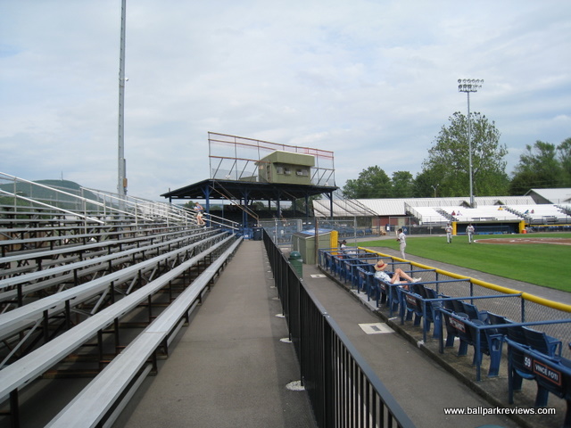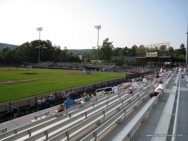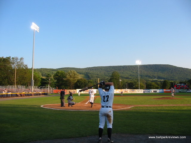 | This is minor league baseball at its purest. Damaschke Field is a cozy little park, just half an hour away from Cooperstown. There are no promotions, no fancy scoreboards (though a new one was installed in '03), and no wacky sound effects. The team claims to have a mascot named Sam (a tiger), but I have yet to see him. What takes place here is just baseball. A covered grandstand sits behind home plate with a few box seats and backless benches. There are bleachers that run down both foul lines. The thick screening (more like a fence, than a screen) behind home plate can be obstructive at times, but adds to the uniqueness of this old park. Concessions are limited, but very reasonably priced. This also continues to be one of the only parks in the country that doesn't serve alcohol as the owner is trying to make the atmosphere as family friendly as possible. A very easy place to obtain autographs as the players must walk right by the stands to get from the clubhouses to the field. The backdrop is quite scenic, with mountains beyond the outfield fences. In this age of new ballparks popping up in almost every city, Damaschke Field doesn't seem suitable for affiliated minor league baseball, but as long as Sam Nader continues to own this franchise, it will continue to host a professional team. And that's fine by me, as Oneonta is the perfect place (with its proximity to Cooperstown) to host a pure baseball experience. Some badly needed renovations were completed before the '07 season. These included new bleachers (with backs) on the 3rd base side and a new building which houses the clubhouses, the main concession stand, and the bathrooms. In addition, the parking lot was moved closer to the ballpark and the exterior was painted and dressed up a bit. These improvements have certainly made Damaschke Field a more comfortable place to take in a game. Unfortunately, Sam Nader sold the team before the 2009 season and the new owner lied about keeping the Tigers here through at least the 2010 season. The Tigers moved to Norwich and Oneonta is now left without professional baseball. What a shame.
