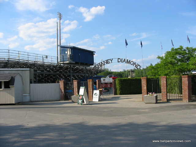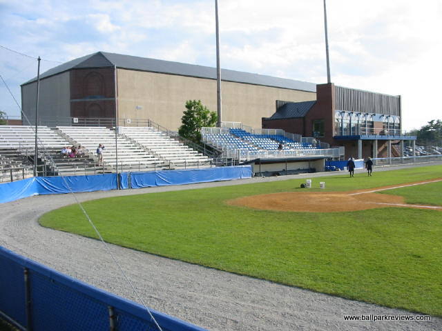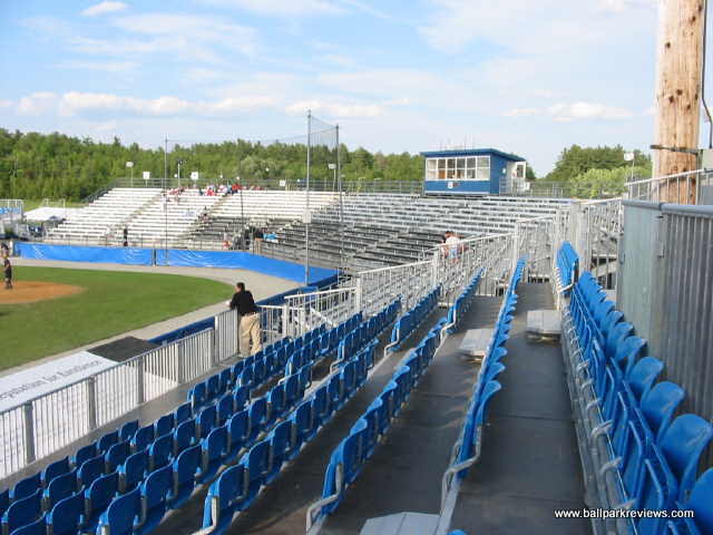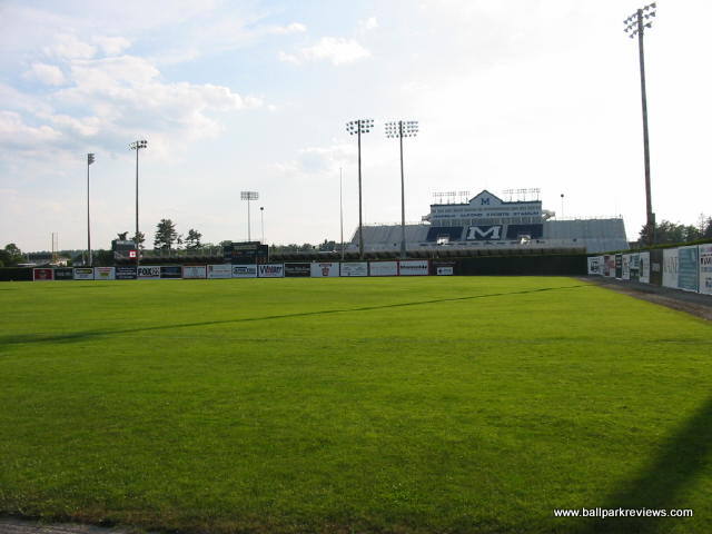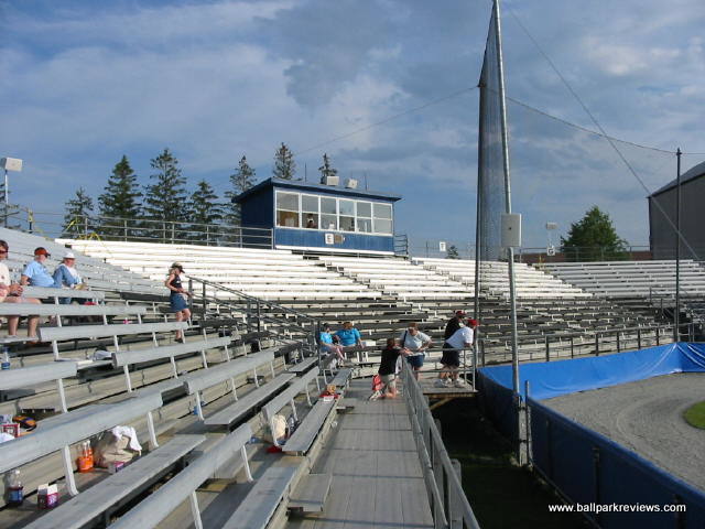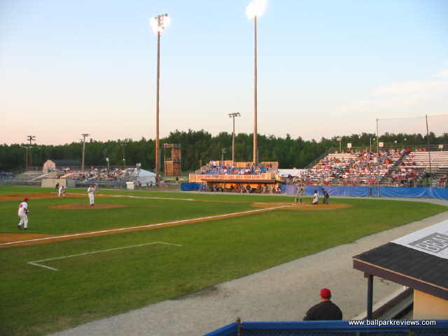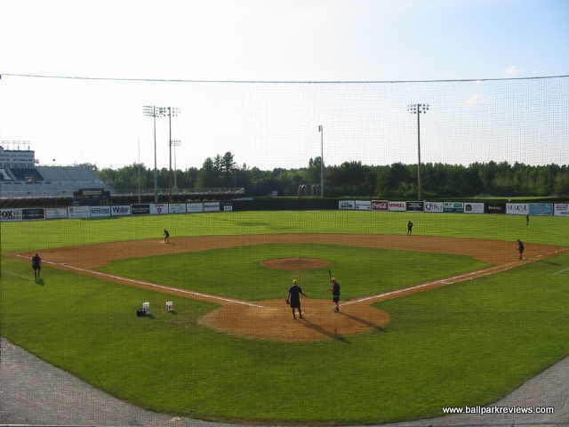 | Mahaney Diamond is back for a second time in 2003 as a host to a Northeast League team. Previously, it hosted the Bangor Blue Ox from 1996-97. When the Lumberjacks announced their move from Glens Falls, they were supposed to be playing in a renovated park on the campus of Husson College. When those plans fell through, they were forced to accept Mahaney Diamond as their home. While it may be a fine facility for college baseball (it hosts the Maine Black Bears), it really is not sufficient for minor league baseball. The structure is all metal with mostly bench seating. Two box seat sections were added behind the dugouts before the '03 season. Also, a new concession/bathroom building was built as a result of the Jacks moving in. The concessions are pretty basic - with only the basic ballpark fare offered. The hot dogs are actually red in color (kinda creepy), but are average in taste. Fans here didn't seem to be into the game much - they seemed most excited when the "Beverage Batter" was up. Of course it is hard to concentrate on the game when there are tons of sound effects blaring - the team used too many and there didn't seem to be any rhyme or reason to when they were played. As with many new teams, they think it necessary to play sound effects just because they can. Because of this, I didn't find the atmosphere to be all that relaxing. After the 2003 season, the Lumberjacks moved into a new stadium on the campus of Husson College.