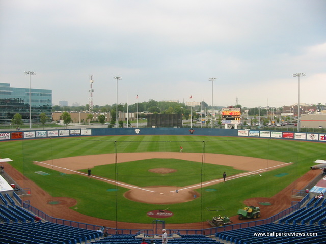 | When it opened in 1993, RCGT Park (then known as Jetform Park) was one of the best draws in all of minor league baseball. But only a decade later and the Lynx were at the bottom of the attendance figures. So what happened to keep people away ? Perhaps part of it is the ballpark, but that can't be the only reason. RCGT Park is a very ordinary park which has a rather sterile feel because of all the unpainted concrete. The design is more typical of the pre 1990's as the concourse is behind the seating areas and not in view of the field. The seating is made up of all fold down chairs and is split by the walkway which leads to the concourse. This means that half the seats are a bit far from the action. Several concession stands are located along the concourse, but apparently only a few of them are used because of the small crowds. A grill is also located in the picnic area in left field, but for some reason it was not open the night I visited. The variety of concessions is about as weak as you'll find at a minor league stadium with the only unique item being poutine (gravy fries), which is Canada's favorite fast food. Unlike the very unique atmosphere you'll find in Quebec, here it is much like any ballpark in the U.S. Lots of rock music, sound effects, and between inning games. I guess that can be attributed to the fact that most of the front office is American. Ottawa Stadium is located on the east side of Ottawa, directly off Rt 417. One nice feature is that it is sunken below street level - this allows passersby to peer into the park from left field. For those coming from the U.S., it would be wise to exchange your money before coming to the ballpark. They will only take American money at par value. Also, prices here are actually a bit on the high side, even with the exchange rate. Ottawa Stadium isn't a bad place to see a game, but there is just nothing that stands out or is memorable. With the current ownership most likely looking to move the franchise, the Lynx will probably not be here much longer. Of course with so few fans coming out now, not many people will miss them anyhow. 2007 will be a lame duck year for the Lynx as they will be moving to Allentown in '08, once the new ballpark is completed there. For the 2008 season, a Can-Am League team took up residence here. But they were unsuccessful and folded after just one season of play. After several years of use strictly by amateur teams, the Can-Am League returned in 2015 with a new team, the Champions.