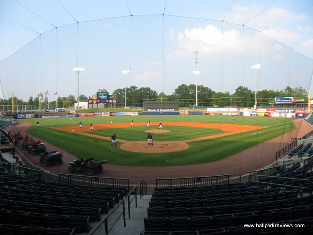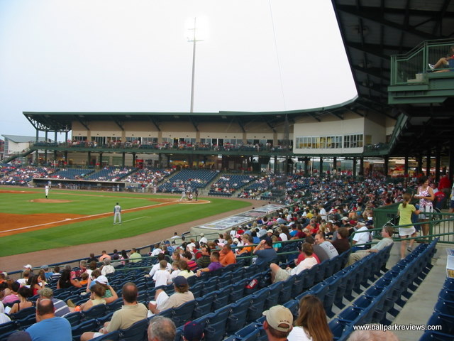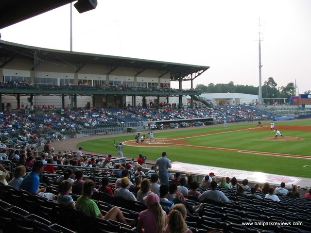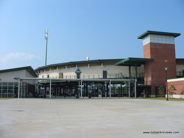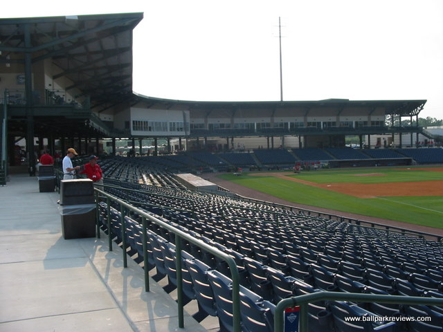| Trustmark Park, located in Pearl, is just five minutes from downtown Jackson, which is clearly the market that is being served here. While baseball thrived in Jackson during the 1980's, Smith-Wills Stadium was deemed not suitable for affiliated ball in the late 1990's when the team moved to Round Rock, TX. But baseball was reborn again in the Jackson area with the opening of Trustmark Park in 2005. Visible from I20, the park is situated nearby a Bass Pro Shop and in the middle of a sea of parking lots (parking is free here). Because of this, there is no sense of place - while inside the park, you could be anywhere in the country. It follows the usual new ballpark template : a concourse that overlooks the field with luxury boxes stacked overhead. The concourses seem to be extra wide here, though much of the space is underutilized. A restaurant (with outdoor seating) is located behind the right field fence and a large covered picnic area is in left field. Seating consists of all blue fold down chairs, with the ones in the outfield angled toward the infield. A grassy berm behind the left field fence is also available for fans who don't mind not having a seat. Concessions are fantastic at Trustmark Park - there is a great variety of items and the quality is excellent. Some of the menu items offered include a catfish platter, chicken on a stick, burgers, and Philly steaks. The atmosphere is about what you'd expect at a southern park - for the most part it is laid back. The PA announcer is very enthusiastic without being over the top and sound effects aren't blared between every pitch. Several on field games are done between innings, the most unique of which is the hamster race which features two adults in inflated balls racing all the way from the outfield to the infield. The team has three mascots : Pearl, Jackson, and Trusty, but I'm not sure exactly what they're supposed to be. There is also a large play area for the kids in the left field corner. My only minor complaint with the park is the lack of a permanent linescore on the scoreboard. They do have a nice video board, however. While Trustmark Park doesn't break any new ground and looks just like dozens of other new parks that have opened recently, it still is an improvement over Smith-Wills and a pleasant enough place to take in a game.