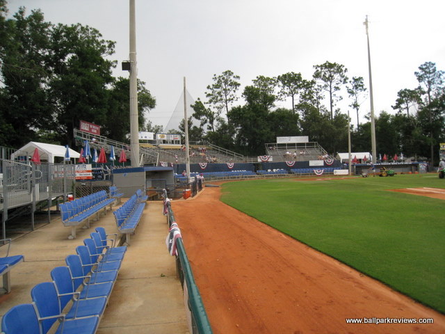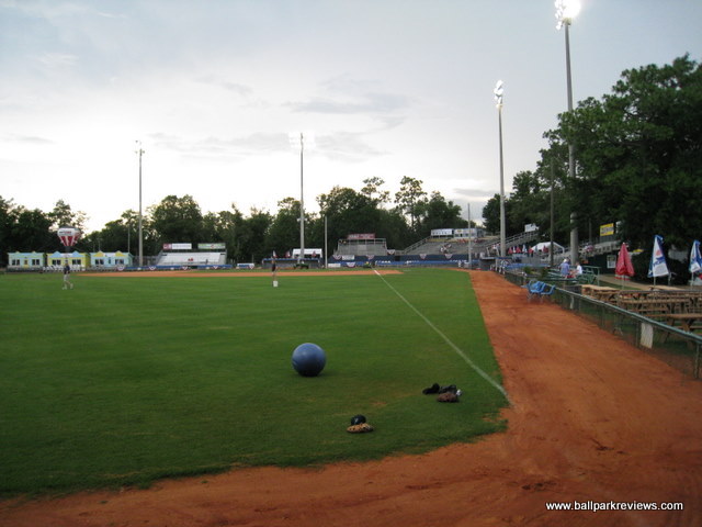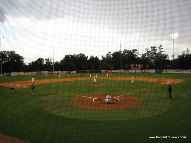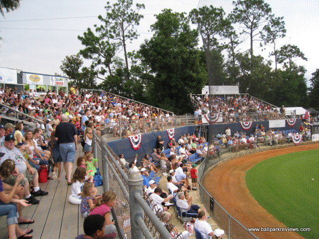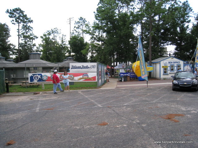 | Pelican Park is a college ballpark that was never meant to host professional baseball, but the Pensacola Pelicans have done a great job at dressing up what would otherwise be a rather bland place to see a game. It will never be the most comfortable ballpark, but it is colorful and the atmosphere is lively. Pelican Park is located on the campus of the University of West Florida, which is in a secluded area north of the actual city. Parking is free in nearby lots on along the street, though you may need to walk a short distance. The seating is comprised mostly of metal bleachers, most of which do not have backs. There are three rows of box seats at the field level, but these are the only comfortable seats in the whole ballpark. Almost all the seats are sold as general admission, which generally isn't a problem unless there are big crowds. There was fireworks the night I attended, so the crowd was rather large, making for a rather uncomfortable experience. There are three “luxury” boxes, but interestingly they are located down the right field line, past the last set of bleachers. They actually resemble little huts and are very colorfully decorated. Picnic areas are located behind the left field fence and behind each of the dugouts. The concourse area is quite interesting here as well. It is lined with large trees and there are a maze of sidewalks that lead to the concession stands, souvenir store, and restrooms. It is unlike any other concourse that I've ever seen. The Pelicans offer a decent variety of concessions, but unfortunately they only have one stand with food. On nights with large crowds, the staff seems a bit overwhelmed and service can be slow. Frito pies, burgers, chicken salad wraps, cheese fries, and chili dogs are some of the unique items offered. The prices are about average, but the quality was quite good. The chicken fingers which I sampled were quite tasty. It is always hard to judge the atmosphere based on a fireworks night as it was when I went, but I found it to be a bit over-the-top and most fans did not seem to care about the game. As is usual now, the Pelicans have an on field host to run the between inning contests. And there was plenty of those : race the mascot, dizzy bat race, and the hot dog race just to name a few. One annoying aspect was that clappers were handed out to fans so they could make even more noise. Also, the ushers acted as cheerleaders which was a bit odd. The team also has a mascot, Scoops, but he really wasn't too active. Fortunately there was not many sound effects played. On a normal night (one without fireworks), I may have enjoyed the atmosphere more. The Pelicans have been trying to get a new ballpark built for the last few years. While plans have been drawn up for a new facility on the waterfront, the financing has yet to be finalized, so an opening date is still unclear. In the meantime, Pelican Park will continue to provide a suitable yet unspectacular home for the Pensacola team. In late 2010 it was finally announced that a new ballpark would be opening in 2012. But not for the Pelicans, but for a relocated Southern League team. Because of this, the Pelicans went dark in 2011.