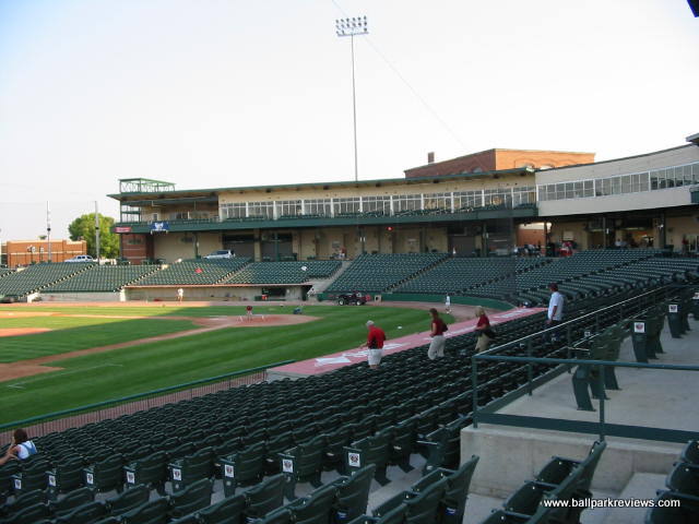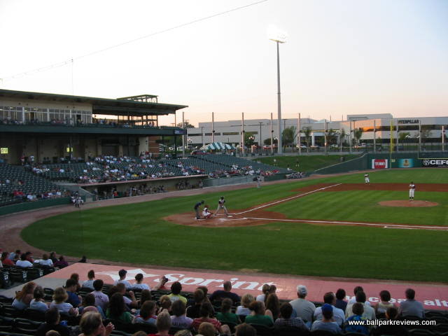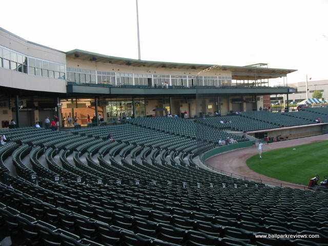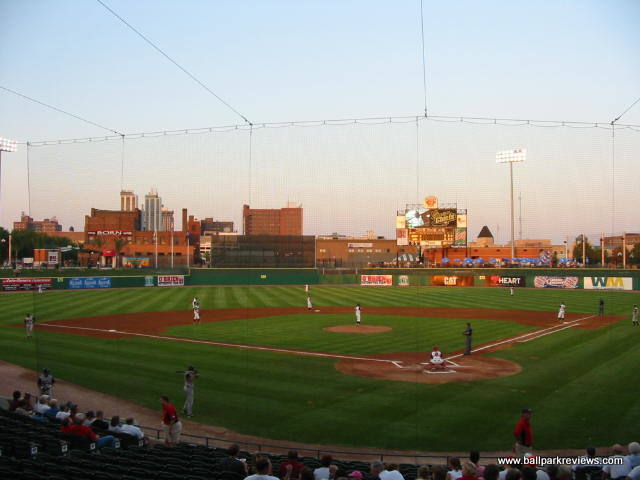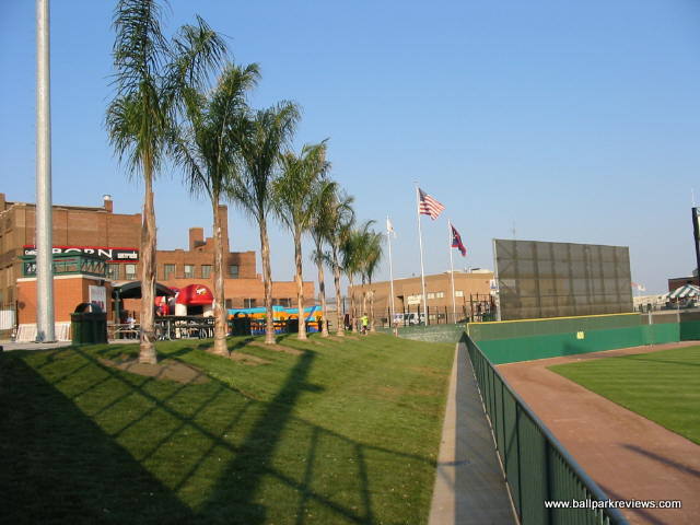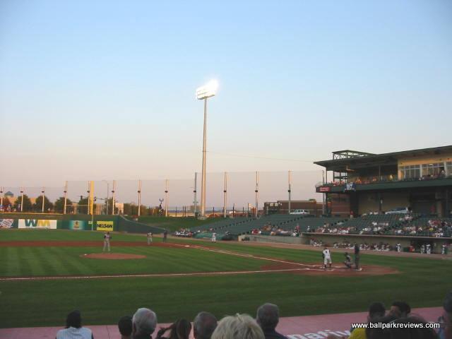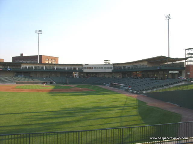 | Sometimes I wonder if new ballparks are built more for the player's needs than those of the fans. O'Brien Field (as it was originally known) is a good example of this. While it is a nice new ballpark, and clearly an upgrade over Vonachen Stadium, does it really offer a lot more ? Obviously the people of Peoria don't think so as they are not exactly coming out in large numbers. I attended a game here in 2003, and it was once of the more depressing experiences I've had at a ballpark, despite it being a beautiful August evening. O'Brien Field is almost an exact replica of Gary's new ballpark. It features an open concourse that runs almost all the way around the park (just a small bridge is missing in center field). The concourse is very wide and features copious space for handicapped seating - more than I've ever seen at any park. There is a grassy berm along the first base side and in left field. An interesting feature of O'Brien field is the palm trees. They line the outfield concourse as well as being part of the landscaping outside the park. Unfortunately, the trees looked a bit sickly, so this experiment, while a unique idea, may not work. For a brand new park, the concessions are quite poor. Only one of the concession stands was open and it only had a limited selection of items (brats, pork chop sandwiches, hot dogs). Because of the several concession stands that were closed, the concourse had a very barren feel to it. Also, because of only one stand was open, lines became quite long. The atmosphere was quite dull as there didn't seem to be many families in attendance and most of the people seemed to be approaching senior citizen age (if they weren't already there). The team tried to get people to dance - they played the Macarena, the chicken dance, and the YMCA, but people didn't seem too interested. The Chiefs also have an annoying on-field DJ who thought he was the entertainment for the evening. Too bad that most of the crowd was ignoring him. There was some music played between batters, but fortunately there were no sound effects used. A nice video board is located in right field, but it was mostly used to show the live play by play of the game - something that should be banned in baseball parks. One other complaint I had was about the starting lineups. They were announced 45 minutes prior to the start of the game, before most of the people had even gotten to the park. Just silly. O'Brien Field is located in downtown Peoria, so parking is somewhat limited. The nearest parking is $4. There is nothing inherently wrong with O'Brien Field - it should serve Peoria well for many years to come. It just doesn't seem like there is great interest in baseball in this city, so what you end up with is a dull atmosphere in an ordinary new ballpark.