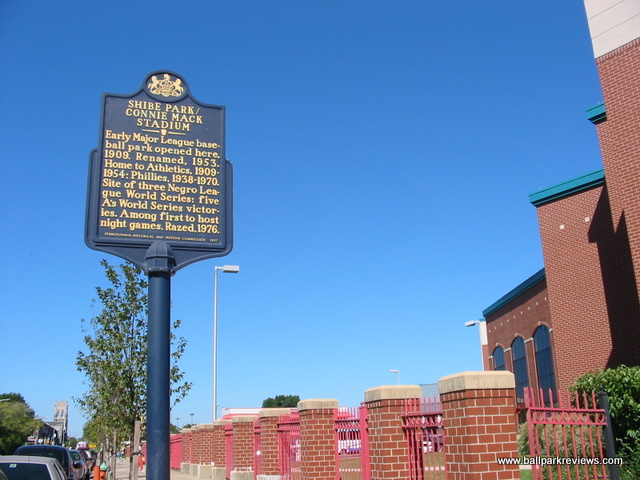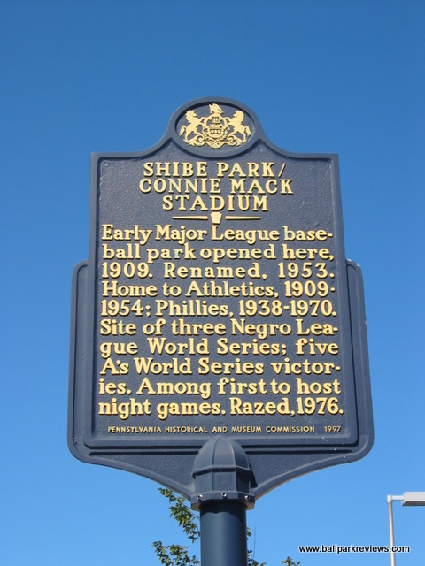 | Shibe Park (later renamed Connie Mack Stadium) was once home to both Philadelphia baseball franchises. The A's played here from 1909-54 and the Phillies from 1938-70. Located north of center city, Shibe Park was surrounded by neighborhoods. It was torn down in 1976 after falling into disrepair. An evangelistic church now stands on the site. The marker above can be found on Lehigh Avenue. |