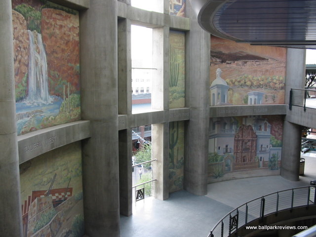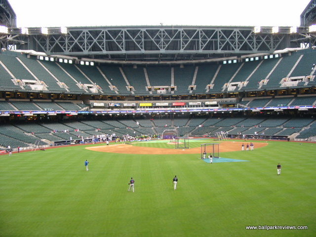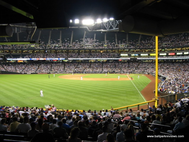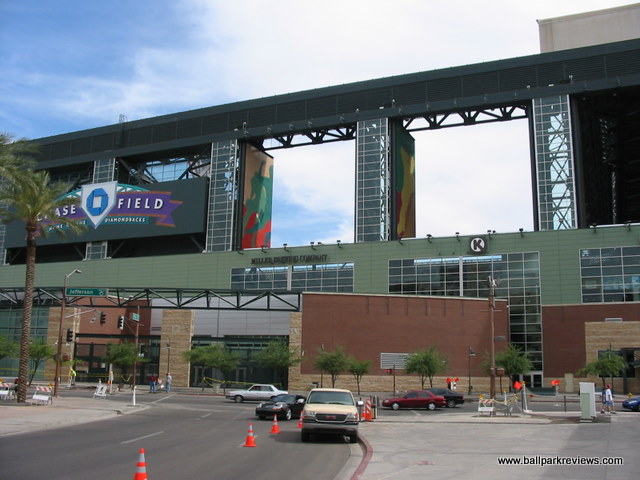 | Chase Field fits in quite well with its surroundings. It is a modern stadium in a modern city. Because the city is so spread out and lacks many skyscrapers, Chase Field really sticks out in the skyline. Built with a retractable roof, the ballpark feels very big and spacious. Also, because it is completely enclosed, there is a complete lack of place. But despite the physical setting, Chase Field is still a decent place to see a game. When the roof is off (which is was for both games I attended), it really feels like an outdoor ballpark (unlike Miller Park in Milwaukee). Chase Field is a typical MLB ballpark with three levels of seating : field level, club level, and the upper deck. For the most part, the field level seats provide good sightlines as they are angled towards the infield. While I didn't sit in the upper deck for a game, it didn't appear to feel as high as other new parks like Coors Field and Great American Ballpark. Both levels feature wide concourses loaded with concession stands to appease every fan's appetite. The choices seem endless : Mexican, Chinese, Japanese, BBQ, and McDonald's are just some of the selections. Also, there is a "Taste of the Majors" stand which has unique items from each of the 16 NL cities. The quality of the food is good and the prices average for an MLB ballpark. The most unique (or perhaps gimmicky) aspect of Chase Field is the swimming pool located behind the right field fence. While a big deal is always made about it, it is hardly noticeable when you're there. The only real negative I could find about the ballpark was the atmosphere. It is a bit "minor league" at times as there are silly contests and games between almost every inning. Also, if you like to roam around to different sections in the ballpark, be sure to do so well before the game starts, as the ushers check tickets closely. Chase Field is located in the Copper District of Phoenix, which is basically just an area loaded with bars, restaurants, and movie theatres. Parking is plentiful and rather cheap by MLB standards. The closest garage only charges $10, but if you don't mind a short walk, lots which charge $3 - $7 are also located nearby. Overall, Chase Field is a nice ballpark, but the lack of intimacy and the "baseball in a box" setting prevent it from being one of my favorites.