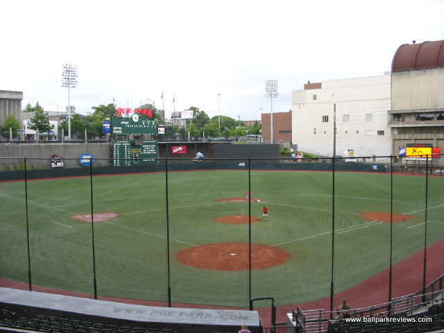 | Why aren't more fans coming out to see games at this great old minor league ballpark ? If Portland wants to be a major league city, they will have to draw better. It's a bit puzzling, especially after a $40 million renovation in the late 1990's. The park is nestled in the downtown and fits right in, mostly because it is sunk some 40 feet below street level. This allows passersby on the street to peak in through the wrought-iron fence and see the game from the outfield. The two main entrances (one in left field and one behind homeplate) each feature a small courtyard and are almost identical in appearance. Once inside, the physical structure of the park is quite impressive. A large roof covers over 90% of the 23,000 seats. The seating is split by a center aisle that leads to the concourse area. Seating above the center aisle is wooden benches with backs. Lower seating is all folding green chairs. Luxury boxes are stacked 4x4 behind homeplate with a few additional ones located on the field level. The seats are a bit far from the field and the upper sections have poles which could obstruct some views. The concourse area located underneath the grandstand is bright, clean, and plenty spacious. Concession stands and a small team store are located on the concourse. There is a limited variety of concessions at average prices. Two picnic areas are located field level and an additional one is located in left field, high above the field. Interestingly, there is no real press box here - instead just a table is setup on the center aisle in front of the luxury boxes. The atmosphere is pretty minor league here - many between inning contests were done, but fortunately sound effects were non-existent. While most AAA parks now have a fancy video scoreboard, you won't find one at PGE Park. Instead, they have a large, hand operated scoreboard in left field - all information is changed manually, from the count to the score to the number of the batter. It is quite neat to see it in action, and a refreshing change from the video boards found at newer parks. I only found a couple negatives about the park. First, why do they need artificial turf ? Secondly, parking is very limited, and what can be found is expensive ($4-$7). Maybe MLB will give Portland a chance to host some Expos games in 2004 - PGE Park is certainly no worse than the park being used in Puerto Rico. But maybe it would be better for Portland to stay AAA - that way one of the classic minor league ballparks could remain in use. It is one of the few relics left in this country. Unfortunately, the Beavers left town after the 2010 season when the city decided that hosting a pro soccer team was more important. PGE Park (as it was last known when hosting baseball) will no longer host baseball and one of the nicest cities in the U.S. is left without the national pastime. For a panoramic of the exterior, click here.
