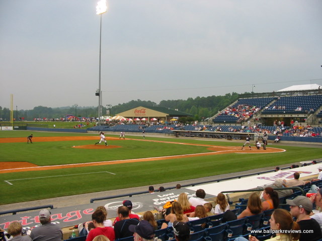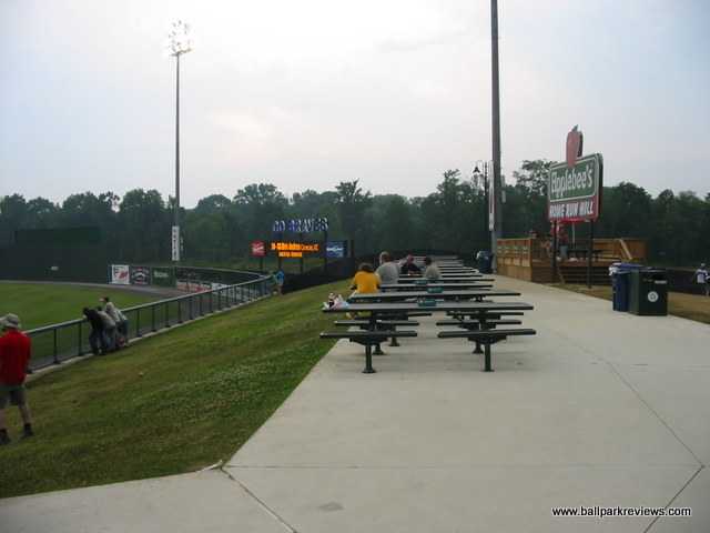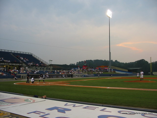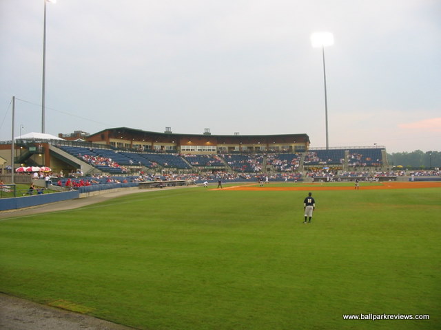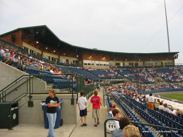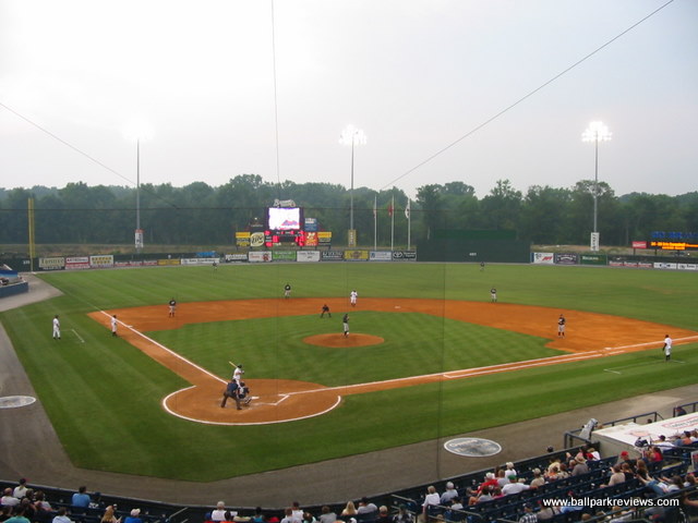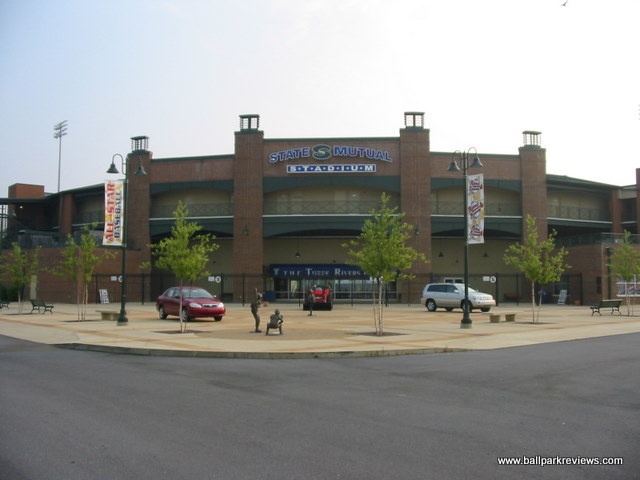 | If you've been to Whitaker Bank Ballpark in Lexington, then State Mutual Stadium should seem very familiar to you. This is a slightly smaller ballpark, but the seating configuration and concourse areas are identical. Even the confusing entranceways to the seating sections are present here. State Mutual Stadium is certainly an adequate new facility, but because it doesn't break any new ground architecturally and because the setting doesn't give you any indication as to where you are, it doesn't rank as one of my favorites. Situated in the northern part of the city, the ballpark can be difficult to find without good directions. Even the directions given by the team can leave you bewildered, but part of the problem is that some of the roads in the area go by two or three different names. While all the seating here is blue fold down chairs, much of it is located above the concourse walkway, meaning that it is a bit far from the field. As in Lexington, the number of the field box seats is quite limited. There is no wraparound concourse (which has become commonplace at new ballparks), but there is a large grassy berm in right field where fans can sit. A large kid's play area is also located in the right field corner. A good variety of concessions is offered, from Mexican to BBQ to Pizza to burgers. The prices are quite reasonable and the quality is above average. In addition to the regular concessions stands, there is also a bar/BBQ area in the left field corner which offers a happy hour before select games. The atmosphere can be best be described as the typical minor league experience. Lots of music between batters and a handful of between inning games. There are also two mascots, Romey and Roxie, on hand to entertain the kids. While I couldn't find any major complaints about this ballpark, I just found it to be rather boring and unmemorable.
