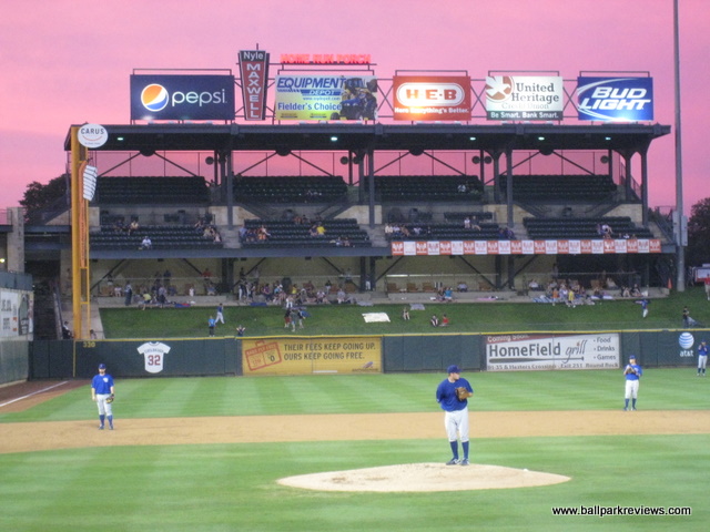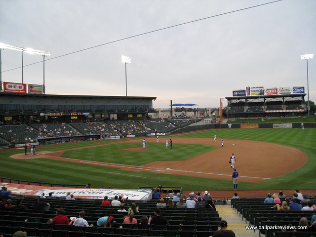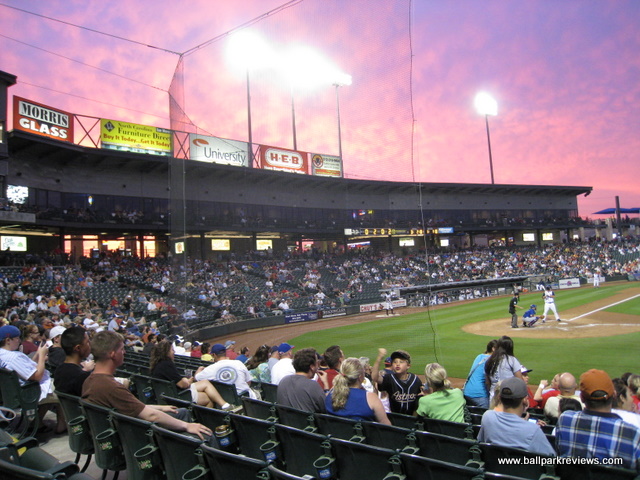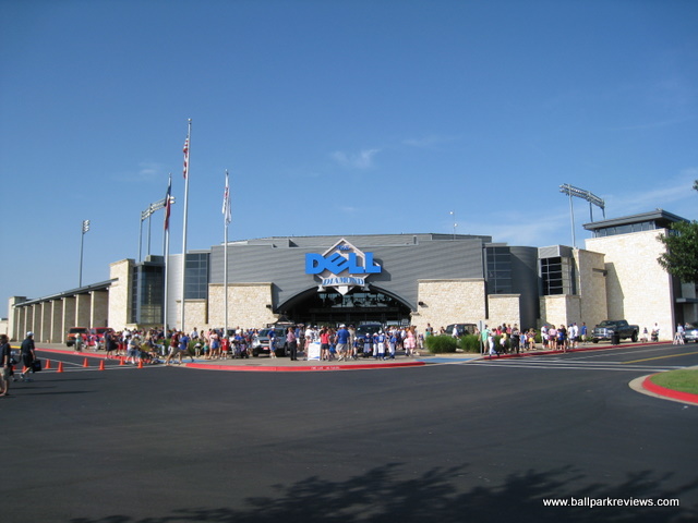 | Round Rock, a suburb of Austin, lured the Jackson, Mississippi franchise here for the 2000 season. The team got a lot of attention initially because of the team name, the Express, which came from the nickname of the team's co-owner, Nolan Ryan. The Dell Diamond is a beauty, though the setting leaves something to be desired. It is located on a busy road (Rt 79) on what seems to be the edge of town, some four miles off of I-35. Apparently it was built in what had been just an open field. Originally built for AA baseball (the Express moved to the Pacific Coast League in 2004), The Dell Diamond is pretty similar to other parks that have been built since 2000, though on a slightly larger scale. It is built into a bowl with the concourse overlooking the field. and luxury boxes located directly above the concourse. The seating sections stretch from foul line to foul line and are all green fold down chairs. The seats past the bags are angled towards the infield, allowing for a good view of most of the action but completely obscuring any views down the lines in the outfield. Additionally, there is a large seating deck in left field which is referred to as the "home run porch." It is very similar to the right field deck at Rangers Ballpark in nearby Arlington, only on a smaller scale. It is probably the park's most distinctive feature. Another cool feature is the wooden rocking chairs that are located underneath the deck - the only other park I have seen something similar at is Banner Island Ballpark in Stockton. The outfield also contains large grassy berms for overflow crowds (which apparently are quite frequent here). Because of the outfield seating, the concourse wraps completely around the ballpark - a nice feature for sure. The only problem is that the concourse closer to home plate can get very cramped and therefore is not conducive to wandering around on during the game. This is because all the concession stands are built perpendicular to the field rather than parallel to it. There is a backside to the concourse, but it seems to be underused and mostly a haven for smokers. This seems to be a design flaw, though the same ownership group used a similar design in Corpus Christi and it turned out much better. Concessions here are outstanding - the variety is great and the quality is high. You may pay a bit more for the food, but it is well worth the price. Some of the unique items the Express offer are turkey legs, sausage on a stick, "Nolie" burgers, Pok-E-Jo's BBQ (inlcuding smoked turkey sandwiches), and garlic fries. A decade into their existence the Express continue to be a great draw at the gate. It is easy to see why with all the fan-friendly amenities they have. There is a large play area for kids in centerfield and a pool available for group rentals in right field. There are also several other group areas available. As with most AAA parks, the experience is mostly geared towards the game on the field. A few between inning games are performed and the team plays lots of unique movie and tv clips between batters, but the Express certainly do not go overboard. Overall prices seem a bit high here ($14 for all box seats, $5 for parking), but this does not seem to keep many fans away. All in all, The Dell Diamond is one of the finer minor league ballparks in the country - a lively atmosphere, tasty concessions, and well maintained amenities combine to make it a top-notch facility.