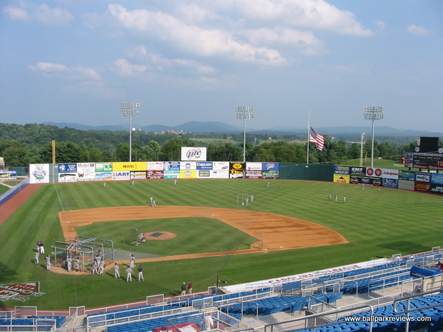 | Salem Memorial Stadium replaced old Municipal Field in 1995, which had served its purpose well for many years but was no longer suitable for affiliated minor league baseball. Because Memorial Stadium was built prior to the big building boon in the late 1990's and early 2000's, it does not follow any specific template. Its location in an open area next to the city's civic center and football stadium allow for an unobstructed view of the Blue Ridge Mountains over the right field fence. Seating (which is all fold down chairs) is made up of three levels : box seats, reserved, and general admission. Sightlines are fine from most seats, though the field is a bit distant from many of the GA seats. You'll want to sit on the third base side to get the best view of the mountains. The main concourse which runs behind the seating area is mostly not in view of the playing field. For this reason, the team has put the bulk of their concession stands in the open area of the concourse behind home plate, which is in view of the field. Concessions are well varied - unique items include Buffalo burgers and BBQ sandwiches. The prices are quite reasonable and quality is above average. A nice team store is located in a building adjacent to the ballpark, but is accessible from the concourse on the third base side. Overall, the park has a very open and airy feel to it. Even the concourses are not completely enclosed. The atmosphere is very typical of most minor league parks, especially in the south. Sound effects were kept to a minimum and the standard on field contests were done between innings - race the mascot, dizzy bat race, sumo wrestling, etc. The team also has two married mascots (Mugsy and Misty), but they were not too active the night I was there. While the structure of the ballpark is not the best, the scenic location and laid back atmosphere make this a fine venue to take in a ballgame.