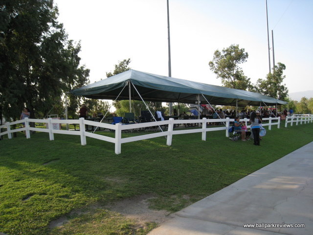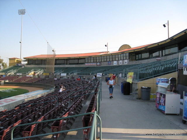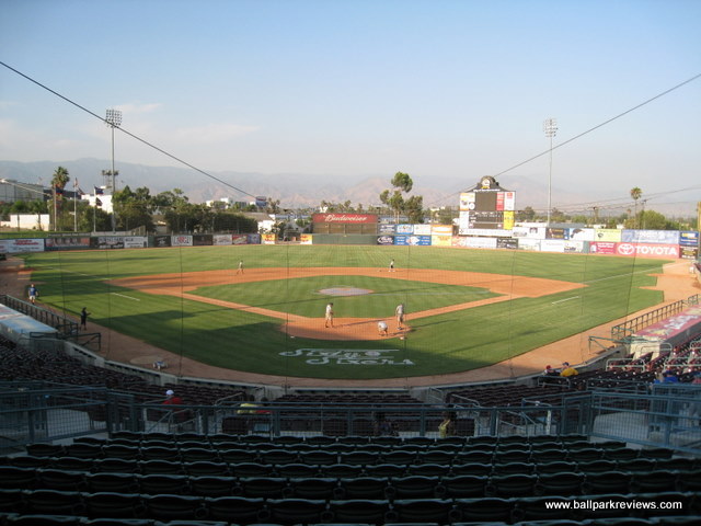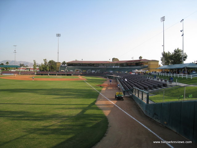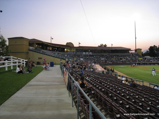 | When you come upon Arrowhead Credit Union Park, there is little mistaking that you are in California. The yellow adobe facade (resembling a mission) and the nicely landscaped exterior with palm trees makes it distinctly Californian. And the same goes for the inside of the park – the San Bernardino Mountains make for a beautiful backdrop. The design of the ballpark doesn't follow the typical new ballpark template with the concourse overlooking the field, but it does mimic the designs of the ballparks in nearby Rancho Cucamonga and Lancaster. So perhaps this design is just a popular trend in California. The concourse area, located behind the seating bowl, is very spacious and is open air due to the absence of any rain. This differentiates it from ballparks in other parts of the country with the same design. Concession stands line the concourse and offer an excellent variety of food options. Included are specialty burgers, tri-tip sandwiches, baked potatoes, Santa Fe nachos, and Mexican (burritos and quesadillas). Quality and prices are about average. Though on the Friday night I attended, they had a great deal – 50 cent hot dogs and quesadillas. This certainly seemed to bring out a lot of fans who were just interested in eating. Another food option is the Pastimes Cafe located down the left field line. The seating is broken into two types – field box seats which run from foul pole to foul pole and reserved seats which are located behind home plate, above the walkway. Unfortunately, many of the sightlines are not so good. The seats past the bags are just too far from the action and the seats in the reserved section are obstructed by many unnecessary railings. A grassy berm is located behind the left field fence for overflow crowds. In addition, there are large picnic areas located behind the seating areas on both the first and third base side. Unlike the picnic areas at most ballparks, these actually provide a pretty good view of the field. Luxury boxes are located at the top of the grandstand. The atmosphere at Arrowhead Credit Union Park also has a rather Californian feel to it, mostly due to the presence of a dance team / cheerleaders. As the home team players were introduced, they ran through the dance team who were lined up with their pom poms. I wasn't sure if I was at a baseball game or a college basketball game, especially since they also performed several dances between innings. There was lots of music played between batters, but sound effects were almost non-existent. Several unique games were played between innings including a toy pickup, a remote car race, and a keg rolling contest. The 66ers also have a mascot, Bernie, who is quite active, but also a bit annoying. He is constantly letting out these little screeches and was dancing on the dugout during the inning, which is a no-no in my book. I do have to compliment the ushers, however. They really seemed interested in ensuring that everyone was enjoying the game. When some fans started to get obnoxious and rude, the ushers politely asked them to settle down. I do have a couple of small complaints about the park, though. First, a new video board is needed – the one they have now is dot matrix and can't be seen until it gets dark. Secondly, there is a bit too much unpainted concrete, especially below the luxury boxes. Would it be asking too much to hang some banners there ? Overall, though, I really did enjoy my visit to San Bernardino. Arrowhead Credit Union Park is clean and fun and the setting is beautiful.