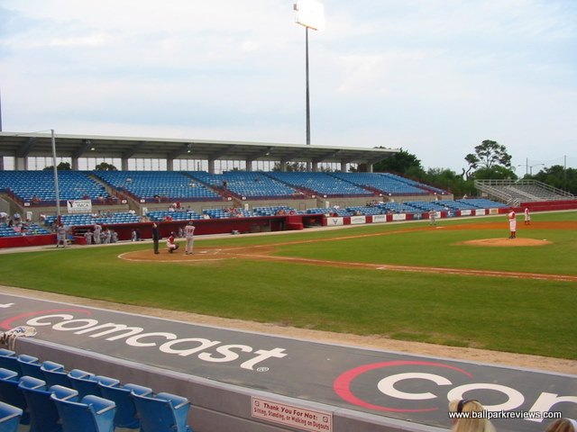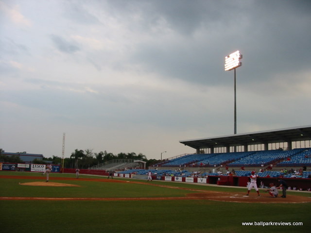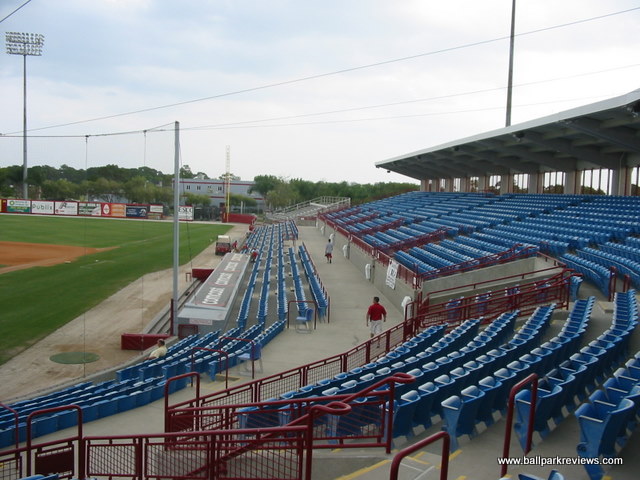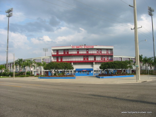 | When you're in Florida, it's not hard to find minor league ballparks. But finding one that provides a good atmosphere and which draws some fans is a bit more difficult. If you attend a game at Sarasota's Ed Smith Stadium, you'll want to keep searching. Among all the minor league ballparks I've attended games at, this is one of the most depressing. The park is just too cavernous and has too much concrete, characteristics that are magnified when crowds are rarely more than 500. Ed Smith Stadium opened in 1988, meaning it feels a bit outdated now. But it is still a perfectly fine venue. The seating bowl is split into a lower and an upper section by a narrow walkway which leads to concourse. The seating extends almost from foul pole to foul pole, meaning many seats are close to the field, but also that many are far from the infield where the majority of the action is. Except for small bleacher sections in both the LF and RF corners, all seating is plastic fold down chairs. They are probably still the original seats as they look very weathered and should probably be replaced. A small roof does cover the back half of the upper level seating, so at least shade is available for those who want it. The uncovered concourse runs behind the grandstand (out of sight from the field) and features several concession stands and a small souvenir kiosk. Concessions are somewhat limited for FSL games as the most unique item offered is the "Big Red Smokey" (a sausage). Prices are a bit high and quality is below average. Clearly the team isn't trying to bring in fans by offering cheap or tasty concessions. With such small crowds, it is not surprising the atmosphere is not at all lively. The team does do a few between inning contests, but just trying to find fans willing to compete in them must be difficult. There has been talk in recent months about building a new spring training park for the Cincinnati Reds, but it doesn't look likely that it will happen. There is nothing inherently wrong with Ed Smith Stadium, so I would think money would be better spent renovating it. Even with a new park, it's unlikely the Sarasota Reds would draw any better, as it's clear the team isn't making much of an effort. Unless you're a real hard core baseball fan, Ed Smith Stadium is probably one you'd be better off seeing during spring training rather than for an FSL game. At least then there might be some fans in the stands. The Reds finally did get their new spring training ballpark, but in Arizona. In 2010, the Orioles moved their spring training operations to Sarasota and in 2011, a $30 million renovation of Ed Smith Stadium was completed, which completely refreshed the look of these once bland ballpark.