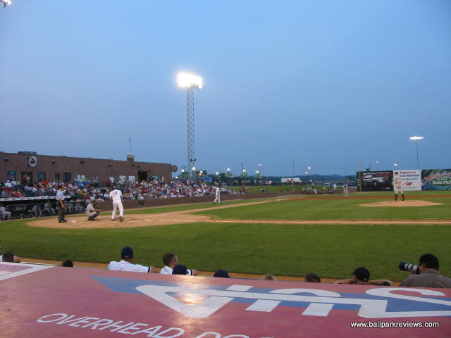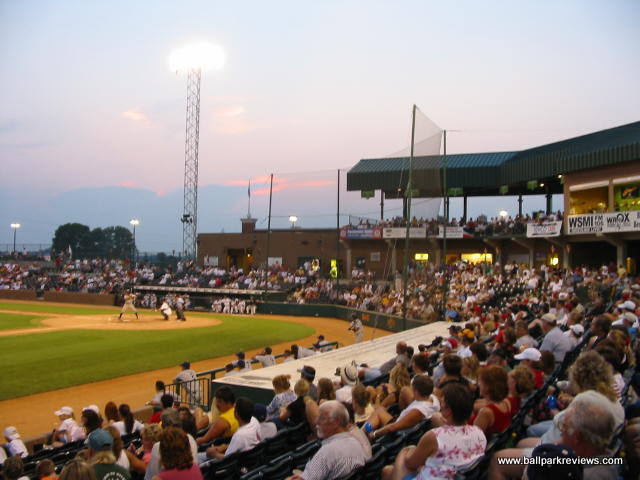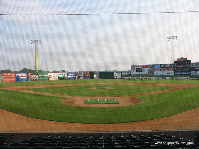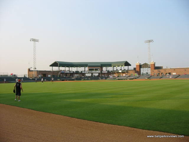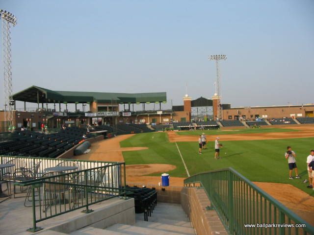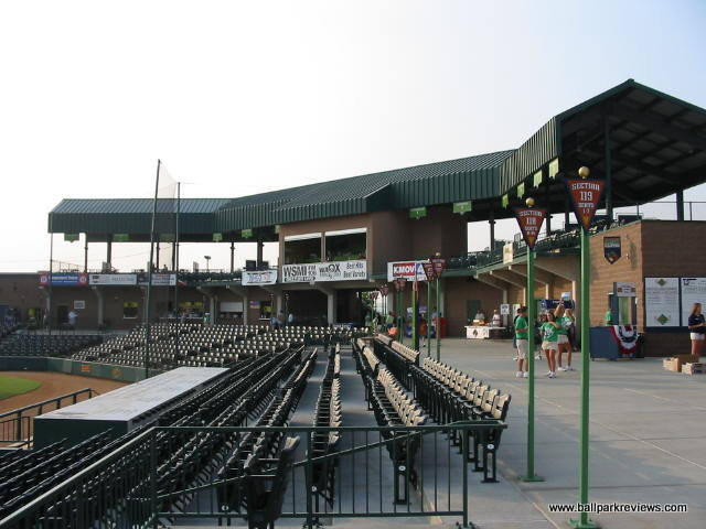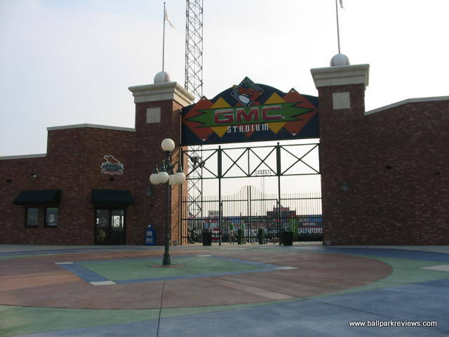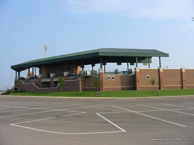 | Keeping with the Frontier League tradition of using parks that are a bit different, Gateway built a new park, that while follows a similar template, has enough differences to make it unique and refreshing. GMC Stadium is probably most similar to Troy's Bruno Stadium. The concourse is completely open and overlooks the field. While it doesn't circle the park entirely, it does go into right field where grassy berms are located. While the park does have luxury boxes, they are not stacked over the concourse, but are located behind it. Usually I don't pay much attention much to the luxury boxes, but here they are one of the unique aspects. They are open air and are each numbered/named after a famous St. Louis ballplayer (i.e. #1 Ozzie Smith, #6 Stan Musial, etc.) Because there are only about 10 rows of seating, all seats are close to the field and provide good sightlines. There are also two grassy berms for overflow crowds - one along the third base side and one in right field behind the outfield fence. Picnic areas are located behind the seating on the first base side and outside the park in right field. Two small hot tubs in the right field corner are also available for rent. Concessions, while well varied, are average in quality and price. The atmosphere was pretty typical of a minor league park. Lots of music is blared between at-bats and innings, so it is rarely peaceful. The Grizzlies do have a good mascot, "Izzy". He is extremely active and even somewhat entertaining. GMC Stadium is located right off of I-255, next to a small airport. While the St. Louis skyline and arch can be seem from outside the park, it's unfortunate that they weren't able to face the ballpark towards it. It would have improved the setting immensely. Parking is plentiful and free. Despite my complaints about the atmosphere, I enjoyed my visit to GMC Stadium quite a bit. It is always nice to see a park where the team didn't feel the need to copycat many of the other new parks being built. For this reason, it is quite memorable.