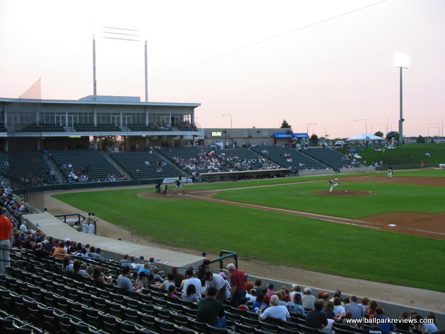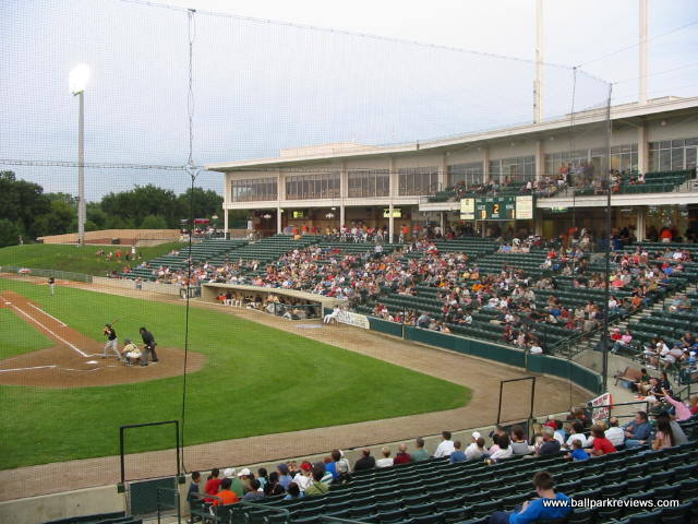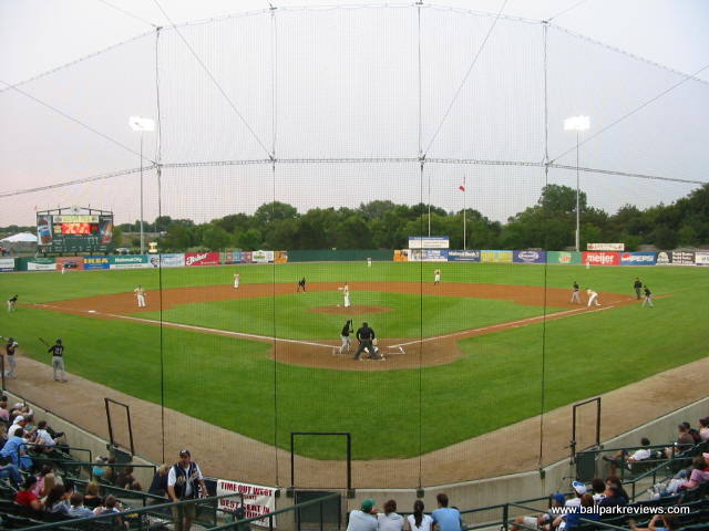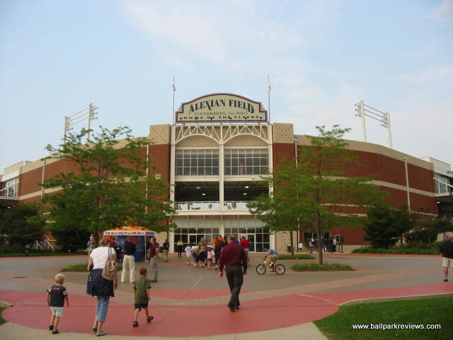 | Alexian Field (as it was originally known), located in a northwest suburb of Chicago, has been referred to as a "mini Wrigley Field", but from the naked eye, the resemblances to the Cubs ballpark are few. That said, this is still a fine ballpark, especially for the independent Northern League. Its suburban location makes for a rather boring setting as it's basically just surrounded by parking lots (parking is free) and highways. There is also a small airport nearby, so planes can be seen going overheard quite frequently. The ballpark itself resembles numerous other parks built since the 1990's. Fans enter onto a concourse that overlooks the field and there are luxury boxes stacked above. Unfortunately, it does not have a full wraparound concourse. There are grassy berms down each line and a picnic area behind the left field fence, but the concourse does not continue into the outfield. The concourse also feels a bit narrow in spots, even when there aren't big crowds on hand. The seats are green fold downs, so you'll be comfortable wherever you sit. Sightlines are good, but there is a bit too much foul territory for my liking. The similarities to Wrigley come in the dimensions of the park, the first base dugout (which is crooked), and the manual scoreboard in left field. Concessions are well varied and quite tasty, but the prices a bit high for the minor leagues. Some of the unique food items include brats, cheddar sausages, and Italian beef sandwiches. There is also a restaurant on the suite level which is open to the public. The atmosphere is pretty laid back, due mostly to the organ music that is played instead of the normal pop and rock music. The Flyers have a mascot, Bearon, who works the crowd pretty well. There are also a few between inning games, the most interesting of which was "Dress Like a Hooter Girl", which pitted two guys going head to head. Alexian Field is a looking a bit worn, so some upgrades may be in order. Sometimes I think teams don't think new parks need to be spiffed up occasionally, but they in fact do. Still, Alexian Field is a comfortable and pleasant ballpark, but there just isn't much memorable about it. In 2011, nobody will be creating memories here as the Flyers folded. Fortunately a new team, the Boomers, launched in 2012.