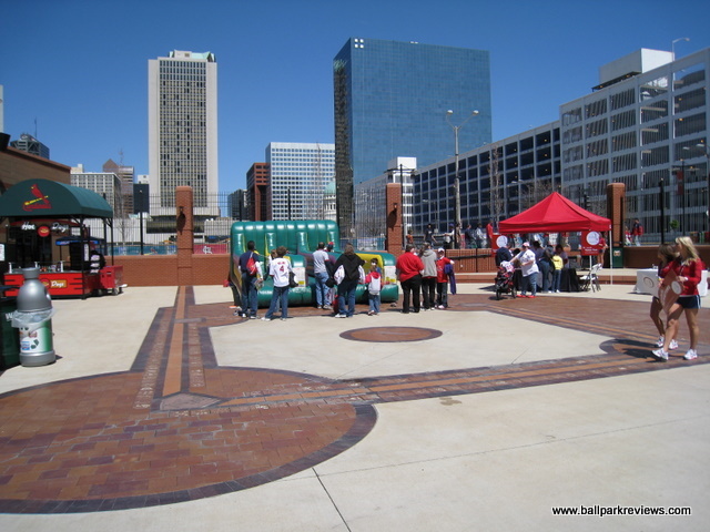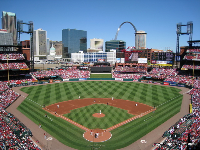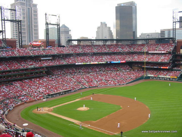 | On my first visit to new Busch Stadium, I was somewhat underwhelmed. Don't get me wrong - it is a vast improvement over old Busch Stadium, but compared to other new MLB parks, it doesn't stack up well. It is located just south of where the old stadium was and actually takes up some of the same footprint. The home plate entrance abuts I64, which means that it is somewhat obscured. The exterior is made of familiar red brick, with each corner entrance of the ballpark looking identical. Inside, the first thing you'll notice is that the main concourse is not open to the field. This is odd considering almost every new park built has this feature. I guess here you will miss the action while running out for concessions. The concourse is very spacious, however, and features some of the only reminders of Cardinal history in the ballpark. The old scoreboards have been hung just as the appeared at the end of the last regular season game at Busch. The seating bowl is most reminiscent of Citizens Bank Park, especially in the upper deck where there are two levels and lots of standing room area between the decks. Because there is no club level here, the upper deck doesn't feel as high as in other parks. The outfield features bleacher seating as well as a large concourse that is open to the field. A kid's play area is tucked under the rightfield grandstand, completely out of sight (which is a good thing). One of the best aspects of the new Busch is the setting. In old Busch, it was completely enclosed, so none of the city skyline could be seen. Here, the outfield is open, so the old courthouse, skyscrapers, and of course the Arch are all visible from many of the seats. It does make for a splendid backdrop. Concessions did not impress me at new Busch. While there are plenty of stands, the variety isn't great and the prices are high. Unique menu items include Italian beef, meatball sandwiches, BBQ, and Mexican. Also, there are several Hardee's stands which seem completely out of place. The atmosphere is great, just as it was at old Busch. Outside of Boston, I don't think there are any fans more knowledgeable than those in St. Louis. This is evidenced by the many fans you'll see scoring the game. A few minor complaints about new Busch - first, there are no out of town scoreboards. While they do keep the scores posted on one of the video boards, I'd prefer to see a dedicated scoreboard for other MLB scores. Second, there just doesn't seem to be enough reminders in the park of Cardinal history. With the storied history that this franchise has, you'd expect numerous statues, plaques, or signs to reflect this. But this is simply not the case. Thirdly, large Hardee's and Budweiser signs are built into the upper deck, almost integrated with the seating. These look tacky and out of place. While I doubt the team will change the advertising, hopefully they are addressing the first two complaints. Overall, new Busch Stadium is a serviceable new park, but one that lacks much character. Fortunately the setting is great and the fans knowledgeable, both of which make this a fine place to watch baseball.