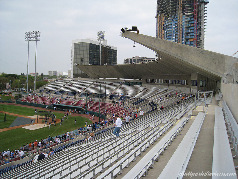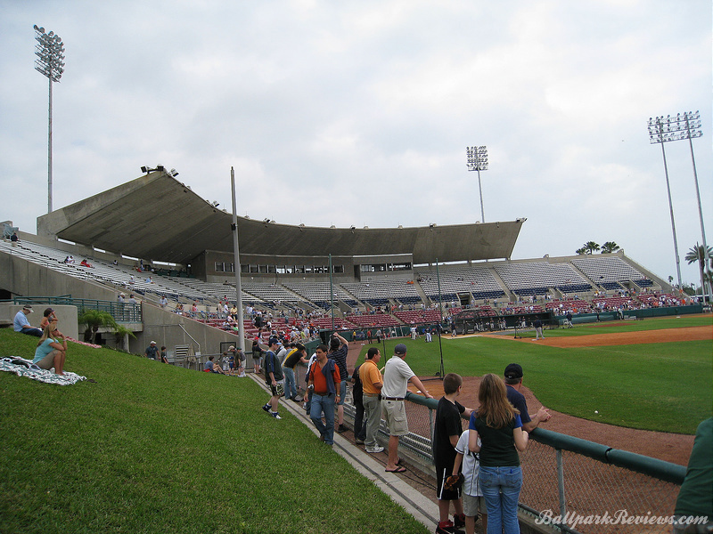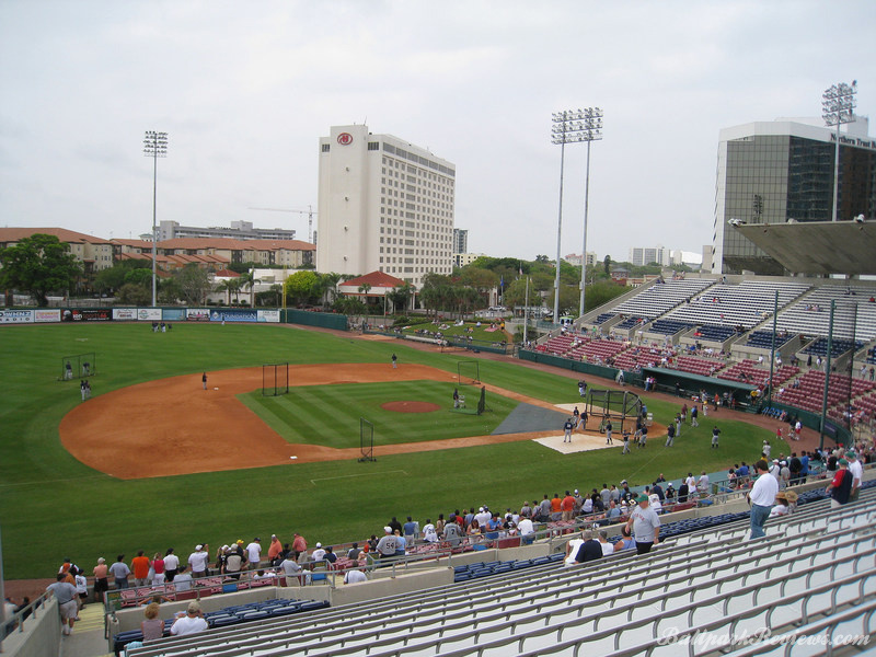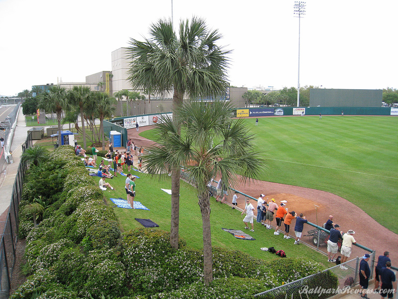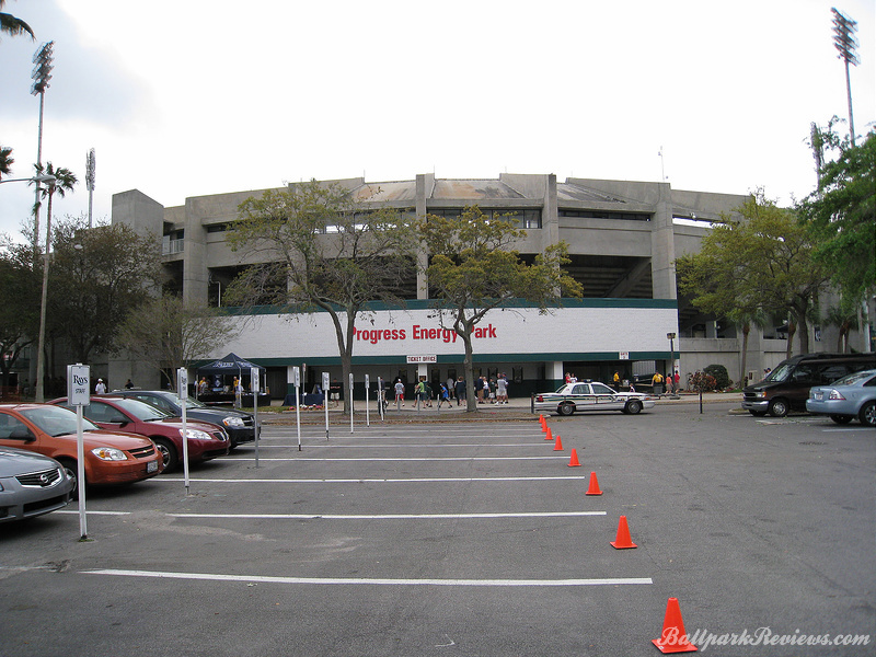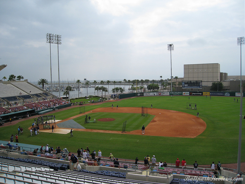 | The best aspect Al Lang Stadium, is its location. It is set right on the bay, so one can see the ocean as well as numerous sailboats over the outfield fence. Also, it is just 12 blocks from Tropicana Field where the major league team plays. It is strange seeing a minor league park so close to a major league one. The park itself is unique in that it features a cantilevered roof that covers approximately half the seating area. It was actually rebuilt in 1977, so features more concrete than I would prefer to see. In addition to the main seating bowl, there are small grassy berms in left field and right field where fans can watch the games from. Most of the seats offer an excellent view of the field as the pitch of the seats is quite steep. The concourse is located behind the seating bowl, out of view from the field. It features numerous concession stands, but can become very cramped with big crowds on hand. There is a good variety of food options available : Italian sausages, foot long dogs, burgers, chicken sandwiches, etc. Concession prices are quite reasonable for a spring training venue. Parking is available in parking garages and surface lots within walking distance. No longer home to a Florida State League team, it now just serves as a spring training facility. But after the D-Rays moving spring training to Port Charlotte in '09, Al Lang Stadium received little more use as a baseball park. While there was some thought to building a new ballpark for the Rays on this site, those plans never came to fruition. Instead, this ballpark was converted to a soccer-only facility, where it has received a second life.
