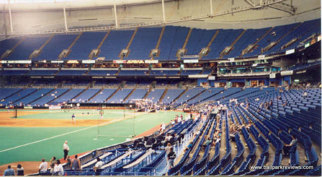 | What good can be said about a dome ? Not much usually. While the Devil Rays have done as much as they could to make Tropicana Field a baseball park, you'll still never forget you are inside watching baseball on an artificial rug. When you enter the park, it feels more like you are entering a shopping mall. There are many games and amusements for the kids and numerous concession stands all with neon lighted signs. There is no way you'd know you were at a baseball park until you take your seat. Prices here are very high - from parking to tickets to souvenirs to food. It just feels as if you are being gouged from the minute you arrive. It's no wonder their attendance is so poor - they field a lousy team and have some of the highest prices of any park. Of course the Devil Rays have already been crying for a new park after just a few years. For a dome, the park is actually configured quite well for baseball. Obviously the Devil Rays could do more with it as they don't have to share it with a football team. It's certainly a better park than the Metrodome and probably Rogers Centre, but those are about the only Major League parks that are worse.